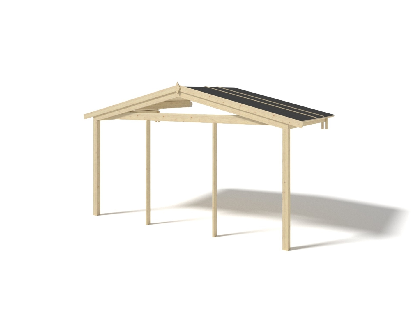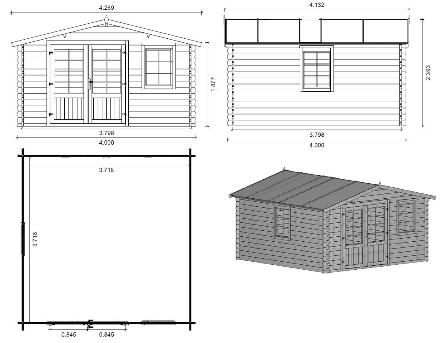 Abri + terrasse et avant-toit - abri d'une superficie de 24 m2, une largeur de façade de 4 m, une profondeur de 4 m et une épaisseur de parois de 40 mm.