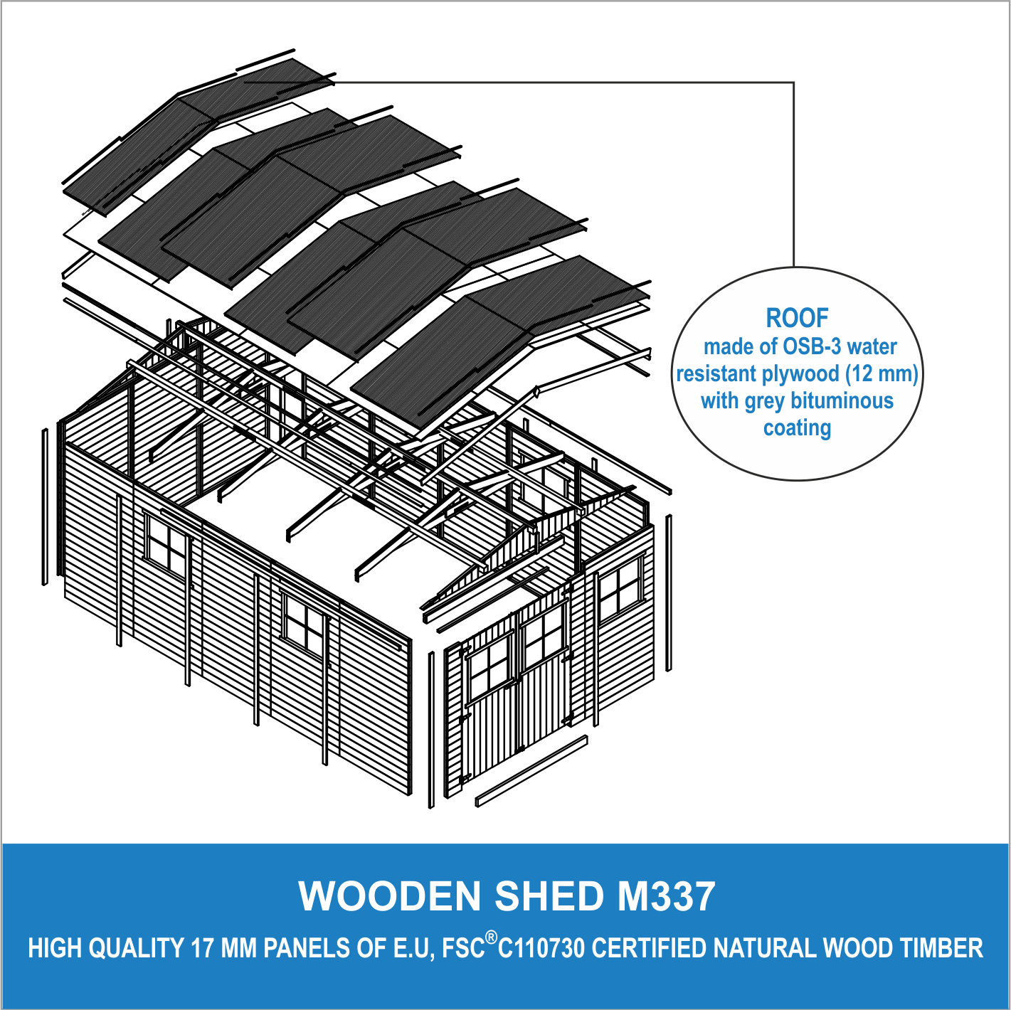 - Toiture en contreplaqué résistant à l'eau OSB-3 (12 mm) avec revêtement bitumineux