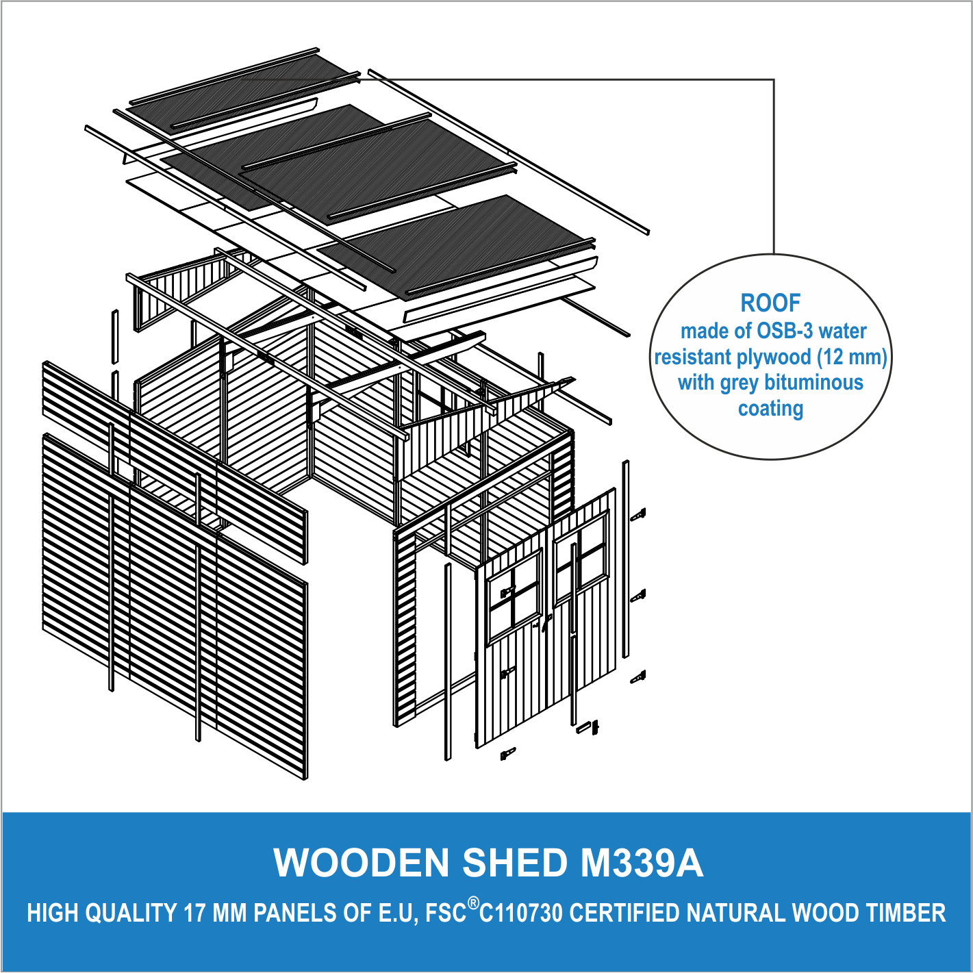 - Toiture en contreplaqué résistant à l'eau OSB-3 (12 mm) avec revêtement bitumineux