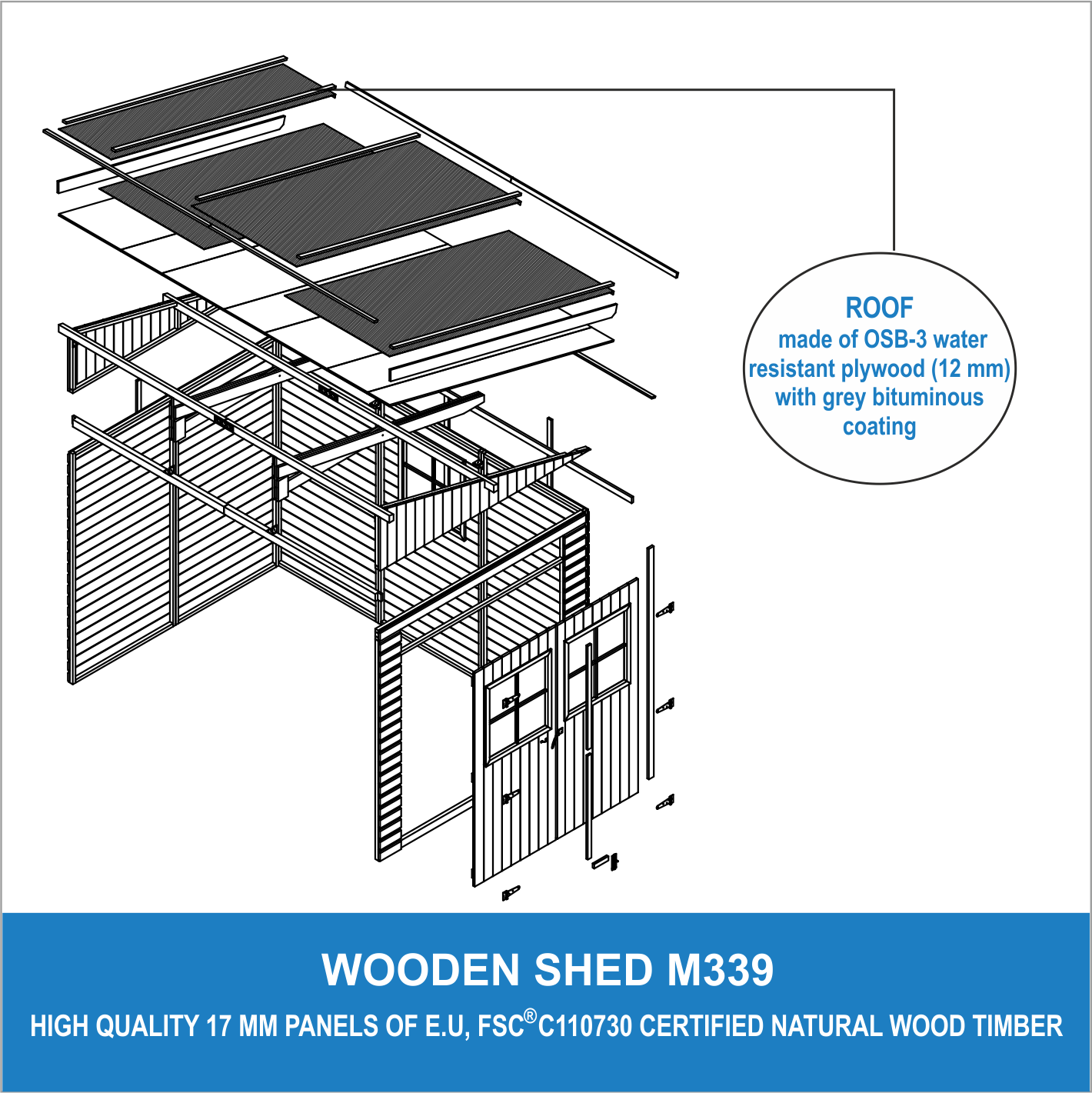- Toiture en contreplaqué résistant à l'eau OSB-3 (12 mm) avec revêtement bitumineux