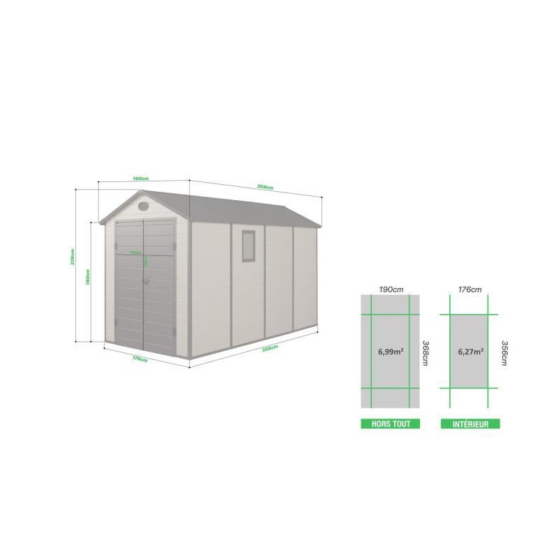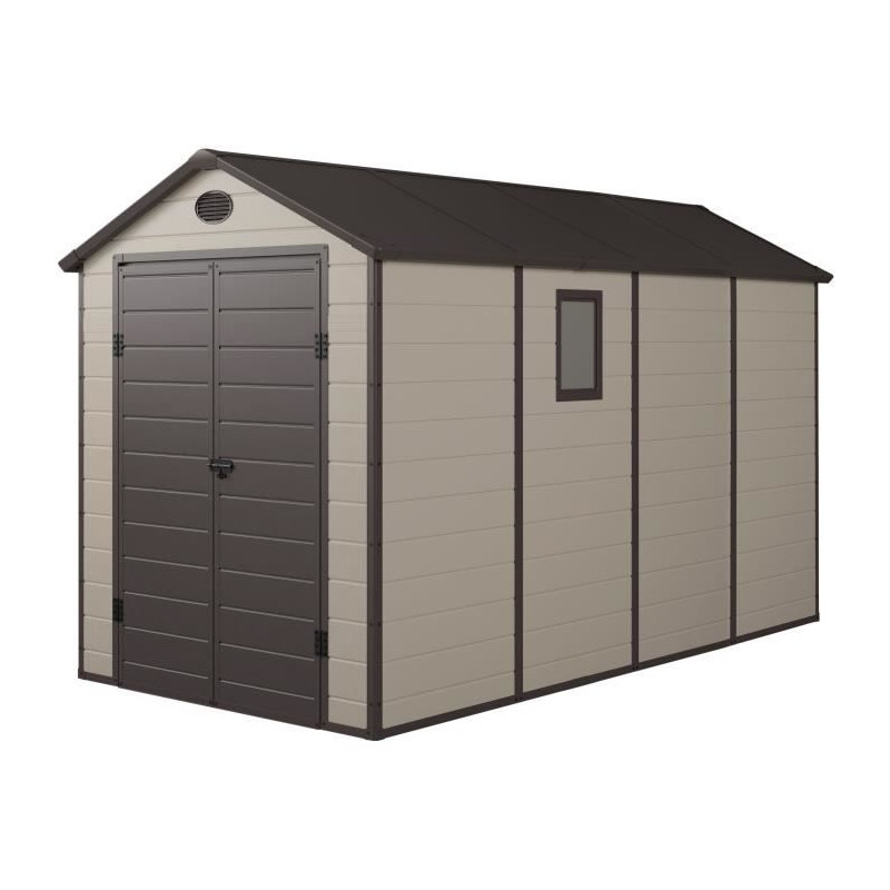 Abris - 6,99 m² - Plancher inclus - Beige et marron - Surface au sol : 176 x 356 cm soit 6.27m² - Dim HT : 190 x 368 x H.226 cm soit 6.99 m² - Materiel: plastique (epaisseur: 12 mm) et acier galvanisé (epaisseur: 1,5 mm) - 1 fenetre vitre en polycarbonate - Toit mono pente - Double porte pleine verouillable (cadenas non inclus).