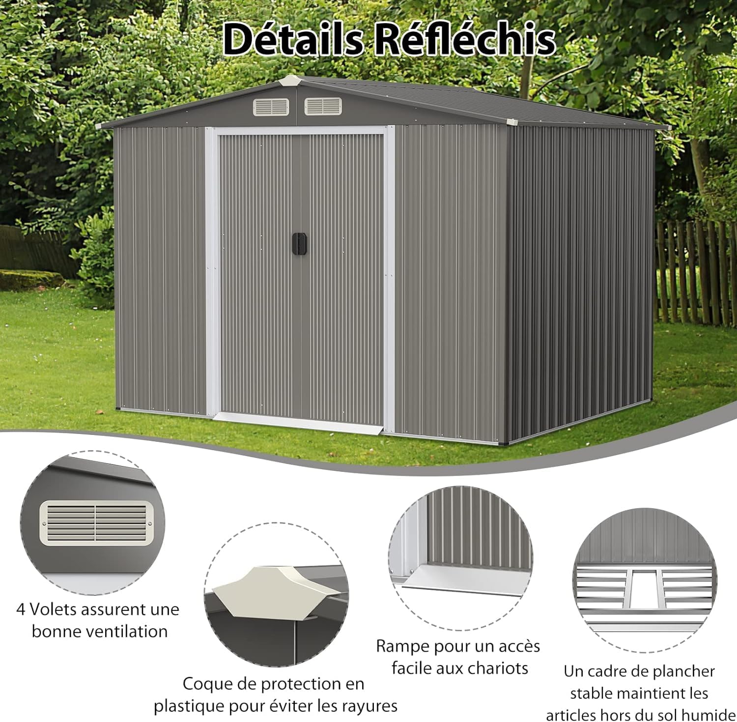 | Libellé | Abri de jardin extérieur en métal avec base, portes coulissantes, cabane de rangement à outils gris foncé |