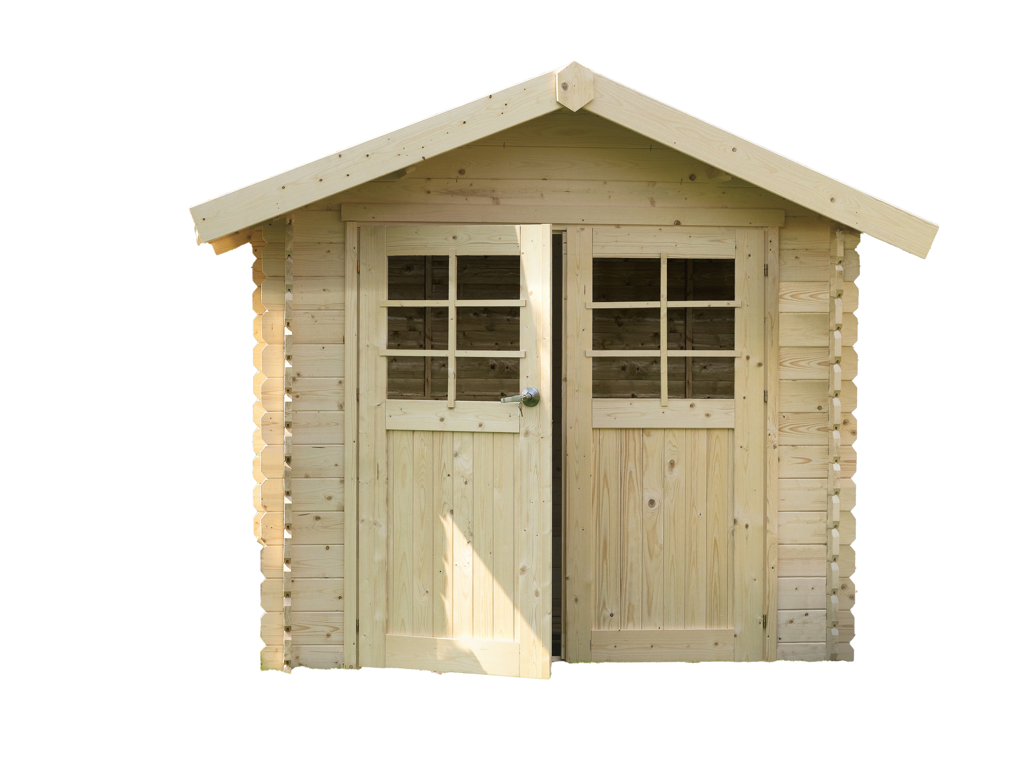 Abri de jardin en madriers de 28 mm à emboiter , les dimensions au sol : 298x298 cm soit une surface utile de 7,53 m² et une surface hors tout de 11,39 m² . Double porte battante avec une serrure à clés en inox , barre de seuil de 2 cm en aluminium pour un accès facile , grilles de ventilation , planchettes de toiture de 16 mm avec feutre bitumeux