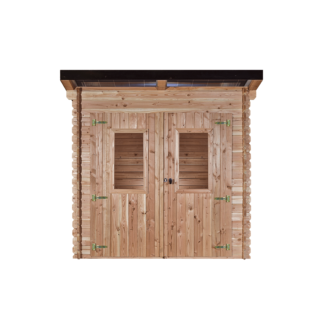 ABRI DE JARDIN MONO PENTE en EPICEA 28 MM 4,49 m2 sans plancher 2 PANNEAUX PHOTOVOLTAÏQUES 1 kWc bois PEFC, panneaux ISO 9001 et 50001 PLUG & PLAY !!! Efficacité : toiture étanche avec les panneaux photovoltaïques Solidité : panneau bi verre les plus résistants du marché (5400 Pa) Performance : panneaux ventilés permettant de limiter les pertes par échauffement Simplicité : se branche sur une prise de courant avec une rallonge classique