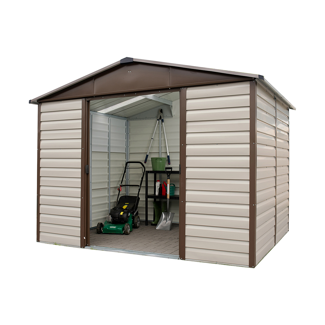 Abri de jardin métal de 11,39 m² de surface hors tout et de 10,20 m² de surface utile. Ne nécessite aucun entretien du fait de sa structure galvanisée. Un design travaillé pour une intégration harmonieuse dans les jardins. Fronton et porte épaisseur 5/10 ème, toit épaisseur 3/10 ème = solidité assurée. Gouttières et panneaux de toit translucides. Ouverture de porte haute et large. Fronton et portes coloris marron. Panneaux verticaux coloris beige. Deux portes coulissantes intérieures. Bords des panneaux pliés pour plus de sécurité. Vis inox anti-rouille. Kit d'ancrage inclus. Dimensions surface utile (L x l) : 281 x 363 cm soit 10,20 m². Dimensions extérieures au sol (L x l) : 285 x 367 cm soit 10,46 m². Dimensions hors tout (L x l x h) : 303 x 376 x 224 cm soit 11,39 m². Hauteur des murs : 180 cm. Dimensions des portes : L 120 x H 178 cm.