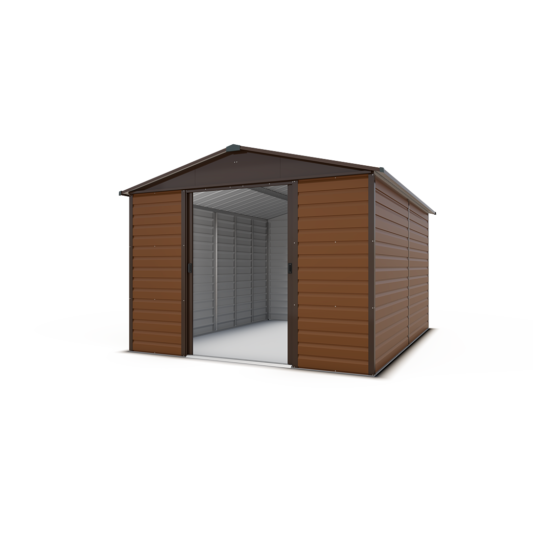 Abri de jardin métal de 11.39 m² de surface hors tout et de 10,46 m² de surface utile. Ne nécessite aucun entretien du fait de sa structure galvanisée. Fronton et porte épaisseur 5/10 ème, toit épaisseur 3/10 ème = solidité assurée. ouverture de porte haute et large. Fronton et toit coloris marron. Panneaux verticaux extérieurs métal imitation bois. Deux portes coulissantes intérieures. Bords des panneaux pliés pour plus de sécurité. Vis électrozinguée. Kit d'ancrage inclus. Dimensions surface utile (L x l ) : 281 x 383 cm soit 10,20 m². Dimensions extérieures au sol (L x l ) : 285 x 367 cm soit 10.46 m². Dimensions hors tout (L x l x h) : 303 x 376 x 224 cm soit 11.39 m². Hauteur des murs : 180 cm. Dimensions des portes : L 120 x H 178 cm.