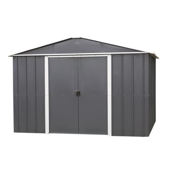 Abri de jardin métal de 12,00 m² de surface hors tout et de 10,76 m² de surface utile. Ne nécessite aucun entretien du fait de sa structure galvanisée. Un rapport qualité/prix imbattable. Fronton et porte épaisseur 5/10 ème, toit épaisseur 3/10 ème = solidité assurée. Ouverture des portes haute et large. Murs intérieurs, toit et encadrements coloris alu. Panneaux verticaux extérieurs coloris gris anthracite. Deux portes coulissantes intérieures. Bords des panneaux pliés pour plus de sécurité. Vis électrozinguée. Panneaux de toit translucides pour davantage de lumière naturelle à l'intérieur de l'abri. Kit d'ancrage inclus. Dimensions surface utile (L x l) : 281 x 383 cm soit 10,76 m². Dimensions extérieures au sol (L x l) : 285 x 387 cm soit 11,03 m². Dimensions hors tout (L x l x h) : 303 x 396 x 202 cm soit 12,00 m². Hauteur des murs : 160 cm. Dimensions des portes : L 120 x H 158 cm.
