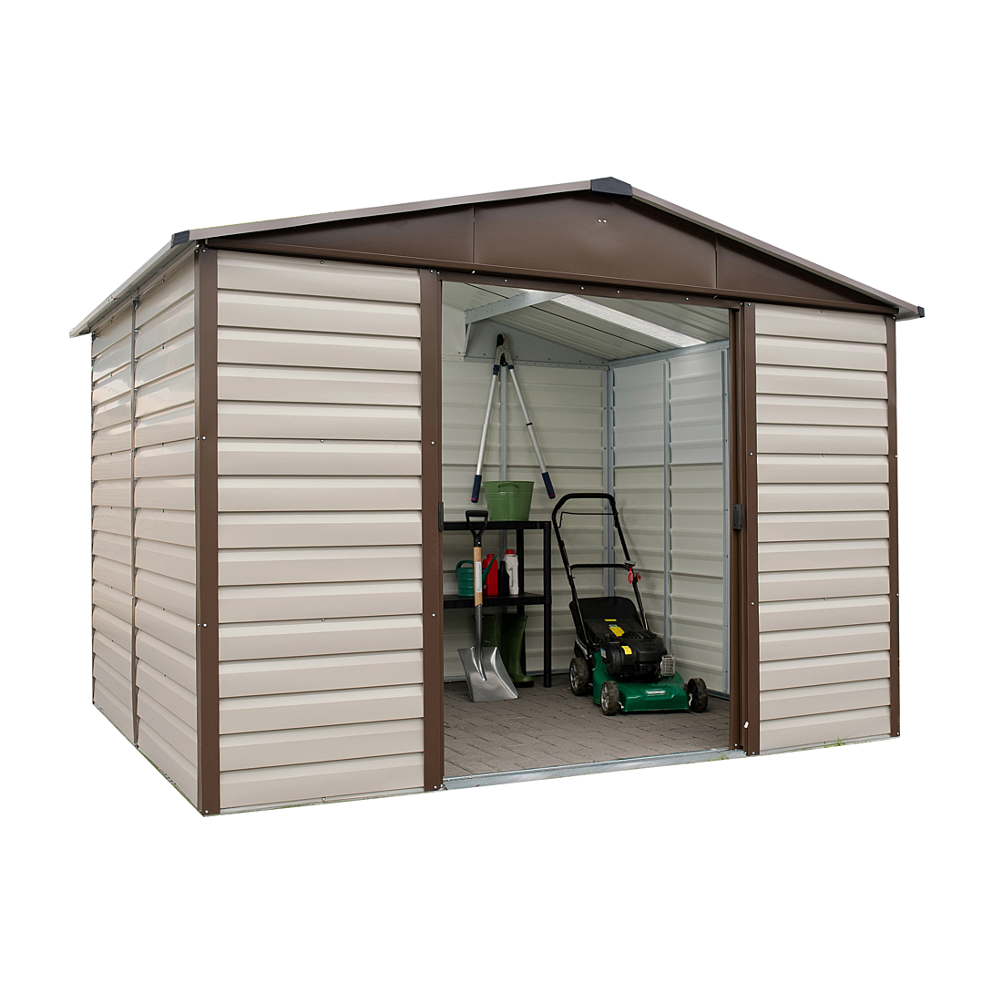 Abri de jardin métal de 5,97 m² de surface hors tout et de 5,11 m² de surface utile. Ne nécessite aucun entretien du fait de sa structure galvanisée. Un design travaillé pour une intégration harmonieuse dans les jardins. Fronton et porte épaisseur 5/10 ème, toit épaisseur 3/10 ème = solidité assurée. Gouttières et panneaux de toit translucides. Ouverture de porte haute et large. Fronton et portes coloris marron. Panneaux verticaux coloris beige. Deux portes coulissantes intérieures. Bords des panneaux pliés pour plus de sécurité. Kit d'ancrage inclus. Dimensions surface utile (L x l) : 281 x 182 cm soit 5,11 m². Dimensions extérieures au sol (L x l) : 285 x 186 cm soit 5,30 m² Dimensions hors tout (L x l x h) : 303 x 197 x 224 cm soit 5,97 m². Hauteur des murs : 180 cm. Dimensions des portes : L 120 x H 178 cm.