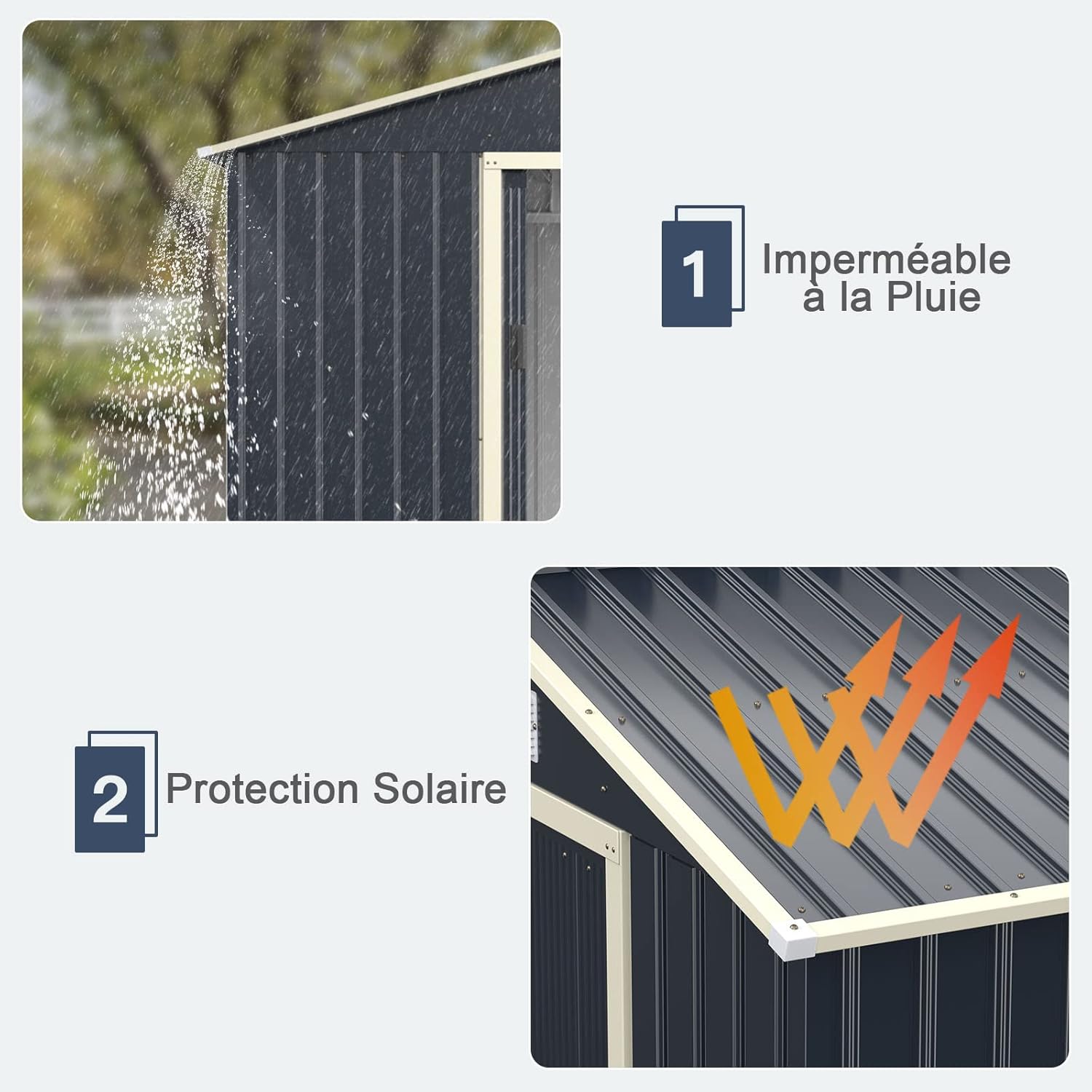 - Excellente résistance aux conditions météorologiques : Fabriqué en tôle d'acier épaisse, cet abri de jardin assure durabilité et robustesse. De plus, ces matériaux imperméables prolongent la durée de vie de l'abri, le rendant parfait pour une utilisation en extérieur sur le long terme, que ce soit sous la pluie, la neige ou le soleil.