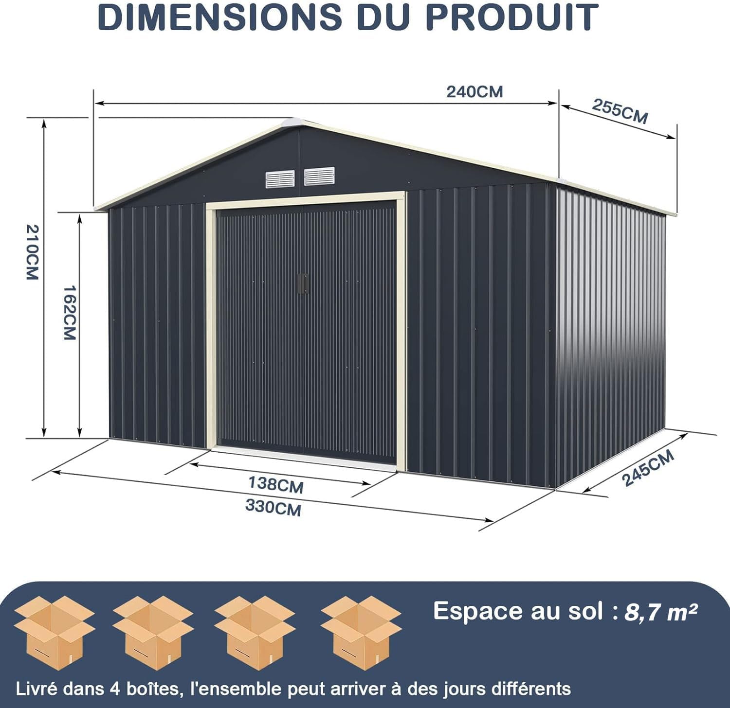 - Extension possible de l’abri de jardin : L'abri de jardin mesurant 330x255x210 cm offre une grande capacité de rangement tout en améliorant le confort d'utilisation. Vous avez la possibilité d'ajouter des boîtes d'extension supplémentaires pour augmenter la capacité sans avoir à investir dans un nouvel abri.