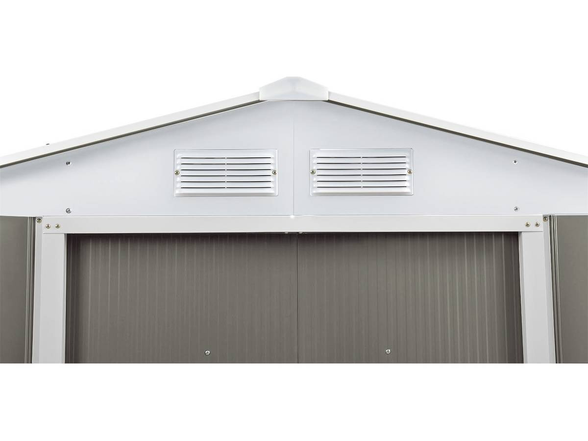L'abri de jardin parfaitPLUS D'ESPACE L'abri de jardin Dallas est la solution idéale pour tous vos besoins de stockage.Placé dans votre jardin, cette remise vous permet d'y entreposer vos équipements d'extérieurs, votre tondeuse à gazon, votre mobilier de jardin, vos outils de bricolage mais aussi les vélos de vos enfants ou encore votre matériel de camping. ACIER GALVANISÉPour une utilisation prolongée et dans les meilleures conditions, cet abri de jardin a une structure renforcée en acier galvanisé.La galvanisation offre une protection contre les agressions des éléments de manière très efficace.En effet il oppose une résistance à la corrosion, aux UV, à l'abrasion, à l'érosion...Cet abri a été entièrement pensé pour vous offrir un espace de rangement extérieur fiable et efficace. UNE AÉRATION OTPIMALEAfin d'éviter les mauvaises odeurs et la dégradation de vos affaires, l'abri de jardin en métal Dallas est équipé de 4 grilles de ventilation.Ces grilles permettent un renouvellement permanent de l'air à l'intérieur de l'abri.UN SYSTÈME D'OUVERTURE PRATIQUE L'abri de jardin Dallas dispose également d'une ouverture en double porte.Tout l'intérêt de cette porte est son système coulissant.Dans les grands comme dans les petits jardins, optimisez votre espace.Grâce à sa fonction coulissante, cette double porte s'ouvre facilement, quelque soit l'encombrement à l'avant. Abri de jardin métal couleur taupe et blanc - Dimensions hors tout : 382 x 340 x 210 cm - Kit d'ancrage sur béton inclus .Descriptif: Abri de jardin métal couleur taupe et blanc - Dimensions hors tout : 382 x 340 x 210 cm - Kit d'ancrage sur béton inclus