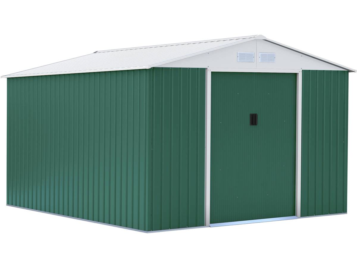 : Abri de jardin métal couleur vert et blanc - Dimensions hors tout : 319 x 340 x 210 cm - Kit d'ancrage sur béton inclus.
