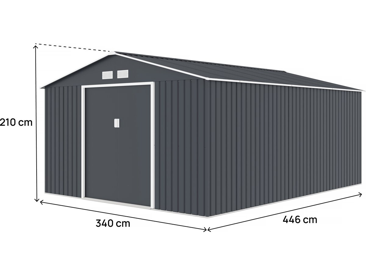 L'abri de jardin parfaitPLUS D'ESPACEL'abri de jardin Vegas est la solution idéale pour tous vos besoins de stockage.Placé dans votre jardin, cette remise vous permet d'y entreposer vos équipements d'extérieurs, votre tondeuse à gazon, votre mobilier de jardin, vos outils de bricolage mais aussi les vélos de vos enfants ou encore votre matériel de camping. ACIER GALVANISÉPour une utilisation prolongée et dans les meilleures conditions, cet abri de jardin a une structure renforcée en acier galvanisé.La galvanisation offre une protection contre les agressions des éléments de manière très efficace.En effet il oppose une résistance à la corrosion, aux UV, à l'abrasion, à l'érosion...Cet abri a été entièrement pensé pour vous offrir un espace de rangement extérieur fiable et efficace. UNE AÉRATION OTPIMALEAfin d'éviter les mauvaises odeurs et la dégradation de vos affaires, l'abri de jardin en métal Vegasest équipé de 4 grilles de ventilation.Ces grilles permettent un renouvellement permanent de l'air à l'intérieur de l'abri.UN SYSTÈME D'OUVERTURE PRATIQUEL'abri de jardin Vegas dispose également d'une ouverture en double porte.Tout l'intérêt de cette porte est son système coulissant.Dans les grands comme dans les petits jardins, optimisez votre espace.Grâce à sa fonction coulissante, cette double porte s'ouvre facilement, quelque soit l'encombrement à l'avant. Abri de jardin Vegas - En acier galvanisé - Dimensions hors-tout : 446 x 340 x 210 cm - Grilles d'aération - Double porte coulissante - Résiste aux UV et à la rouille - Gris .Descriptif: Abri de jardin Vegas - En acier galvanisé - Dimensions hors-tout : 446 x 340 x 210 cm - Grilles d'aération - Double porte coulissante - Résiste aux UV et à la rouille - Gris