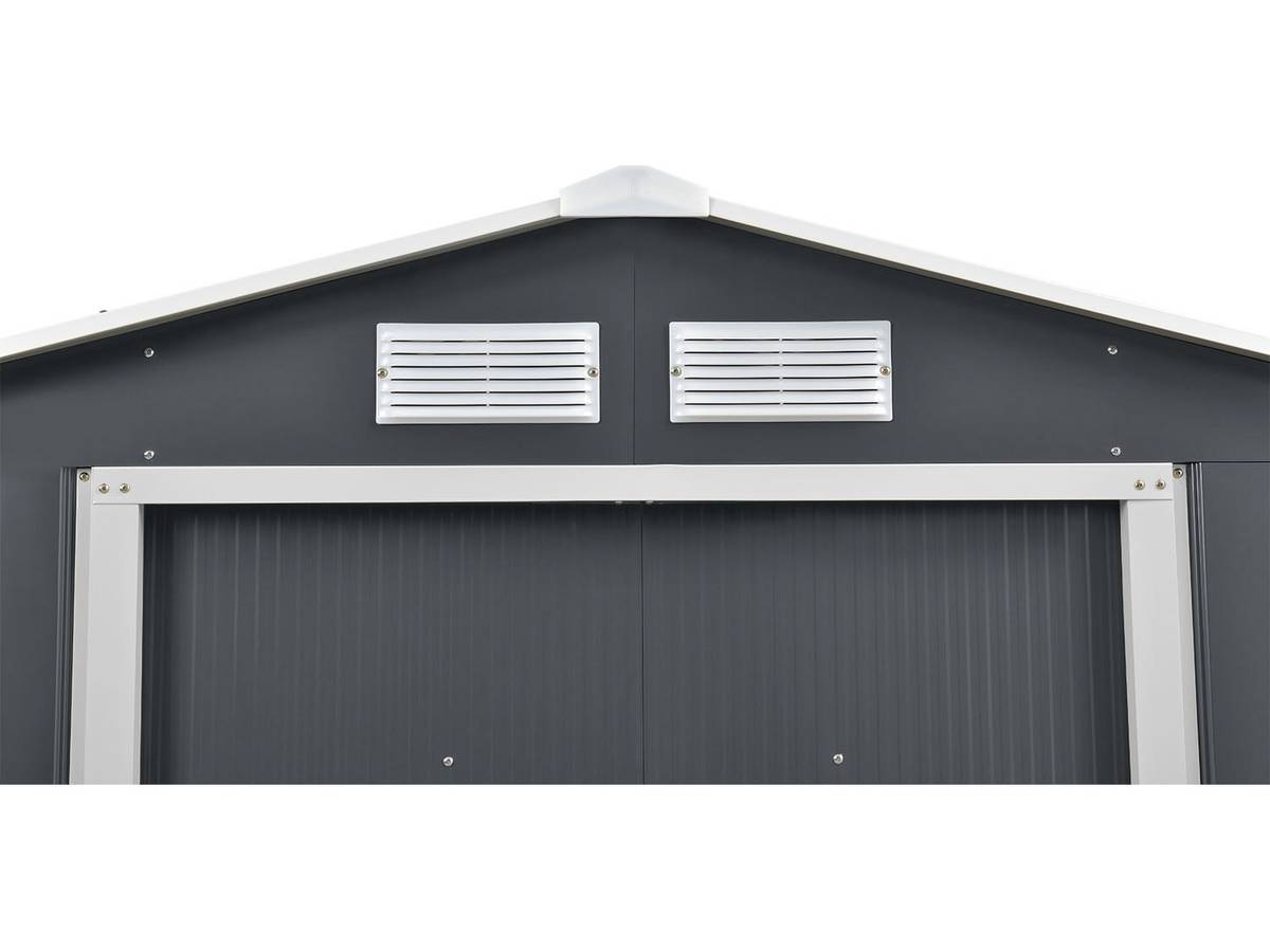 : Abri de jardin Vegas - En acier galvanisé - Dimensions hors-tout : 191 x 277 x 202 cm - Grilles d'aération - Double porte coulissante - Résiste aux UV et à la rouille - Base/fondation non inclus - Gris.