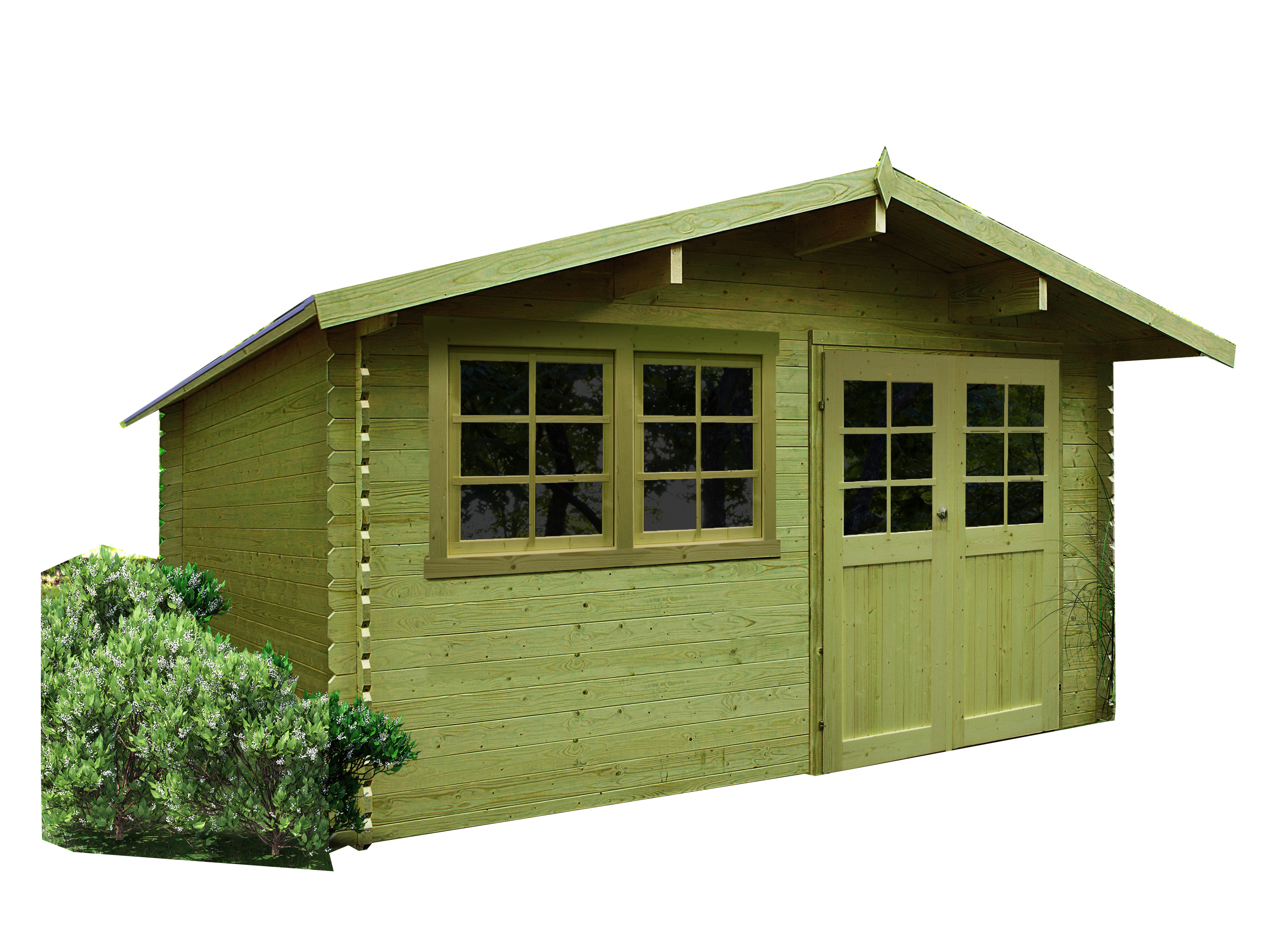 Abri de jardin Niort en bois traité en madriers de 28mm à emboîter. Dimensions au sol 4180 x 2980- 690mm soit 10.82m² utile.