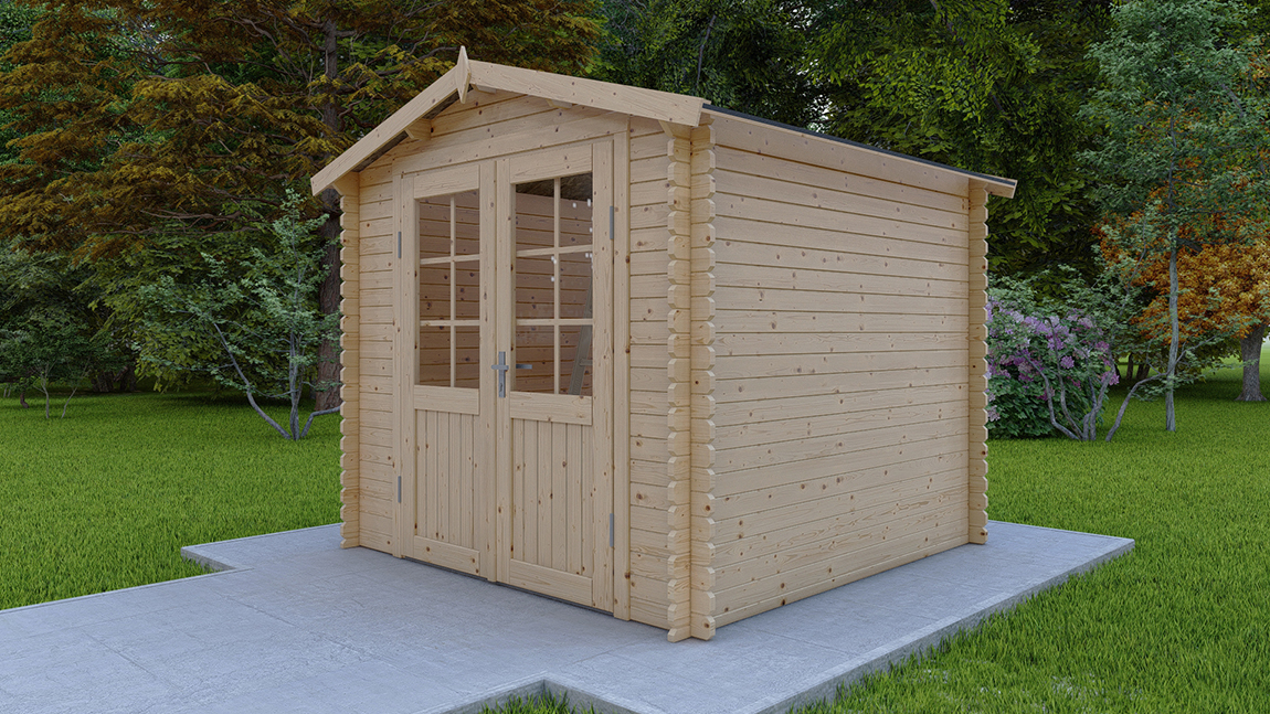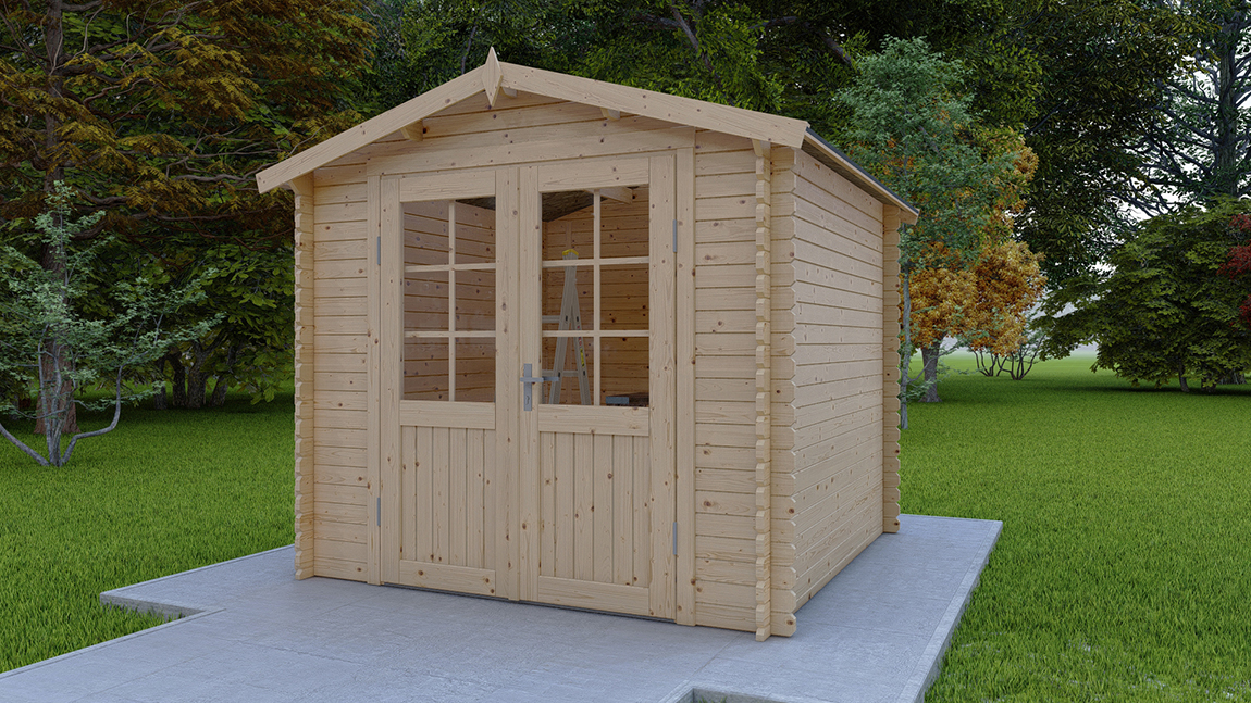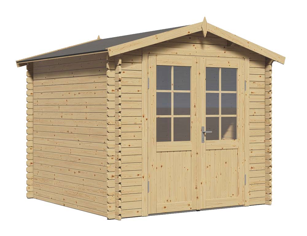 Passer le carrousel d'imagesL'abri de jardin en bois Austin dispose d'une superficie totale de 6,35 m² (251 x 253 cm) et se compose de madriers d'une épaisseur de 25 mm. Dimensions intérieures : 217 x 217 cm Dimensions extérieures : 240 x 240 cm La double porte (dimension : 139 x 179 cm) est vitrée, conférant ainsi à cet abri une excellente luminosité à l'intérieur. Elle comporte une serrure pour sécuriser l'accès à cette remise de jardin en bois. Avec une surface intérieure de 4,71 m² et une hauteur sous faîtage de 213 cm (les murs : 179 cm), l'abri Austin vous assurera un espace de stockage idéal pour votre gros outillage de jardin ou votre mobilier de terrasse. La couverture de la toiture est en OSB 12mm ou voliges 12mm, avec un revêtement en feutre bitumeux. Les avantages du produit : Double porte vitrée et serrure Madriers de 25 mm Fourni sans plancher. Livraison 1 colis : Dimensions (LxlxH) : 270cm x 120cm x 36cm - Poids : 350,0kg
