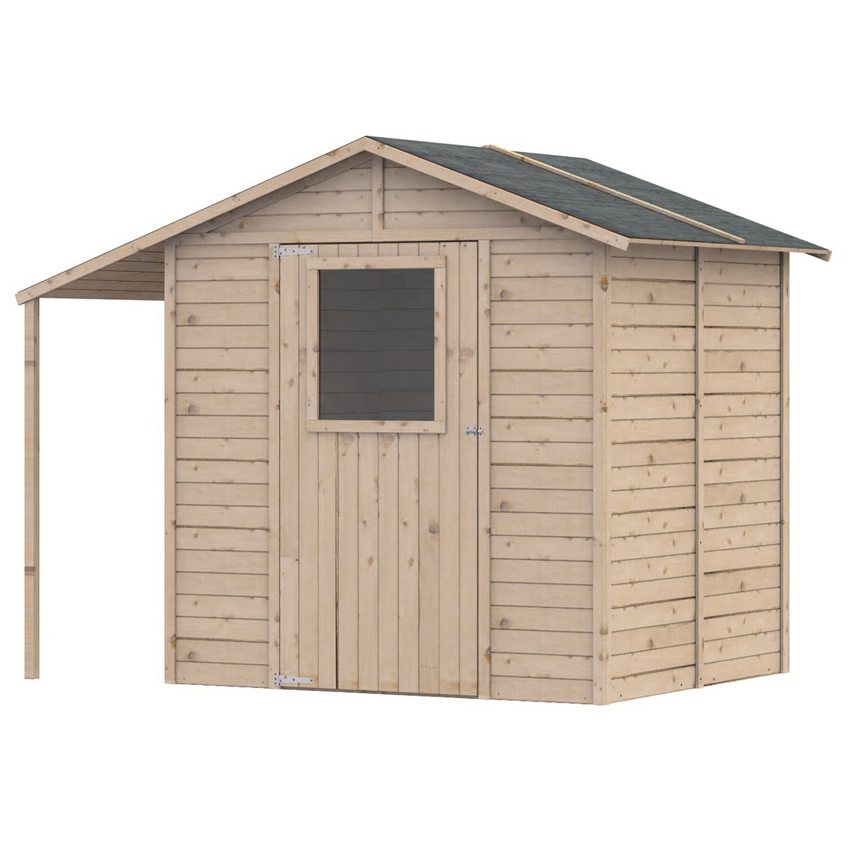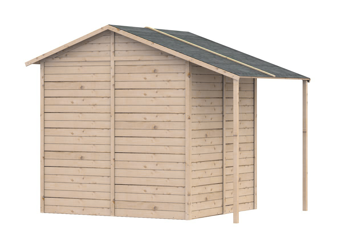 Découvrez notre nouvel abri de jardin en bois SARNY, avec bûcher intégré. Ce petit abri de jardin offre une surface hors tout de 4.6 m², ce qui vous dispense de déclaration de travaux. Il est toutefois assez spacieux afin de vous permettre de ranger votre tondeuse ainsi que tous vos outils de jardin, grâce à sa surface intérieure de 2.7m². Son auvent vous permettra de stocker votre bois de chauffage, ou encore des vélos. Il dispose d'une porte vitrée, de dimension L 82 x H 163 cm. La toiture est recouverte d'un feutre bitumeux. La conception en panneaux vous permettra un montage facile et rapide. Le bois étant brut, nous vous recommandons de le traiter et de le lasurer avant montage. Voici ses caractéristiques : Dimensions hors tout : L 256 x P 182 x H 202 cm Dimensions extérieures au sol : L 239 x P 179 cm Dimensions intérieures au sol : L 174 x P 156 cm Hauteur des murs : 163 cm Hauteur du faitage : 202 cm Fourni sans plancher. Livraison en 1 colis : Dimensions (LxlxH) : 183cm x 121cm x 31cm - Poids : 180,0kg
