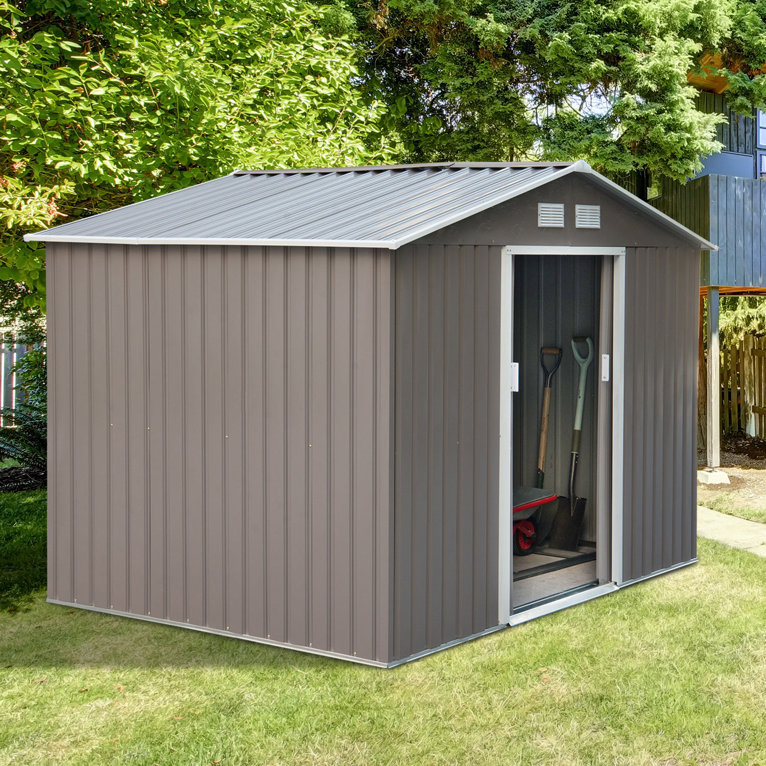 Cet abri de jardin 2 portes coulissantes en tôle d'acier vous sera d'une grande utilité. Disposant d'une surface de rangement de 5,29 m², doté d'une fondation, vous pourrez y ranger vos outils et équipements de jardin (pelle, pioche, rateau, sécateur, tondeuse, transat, équipement de piscine, etc.).
