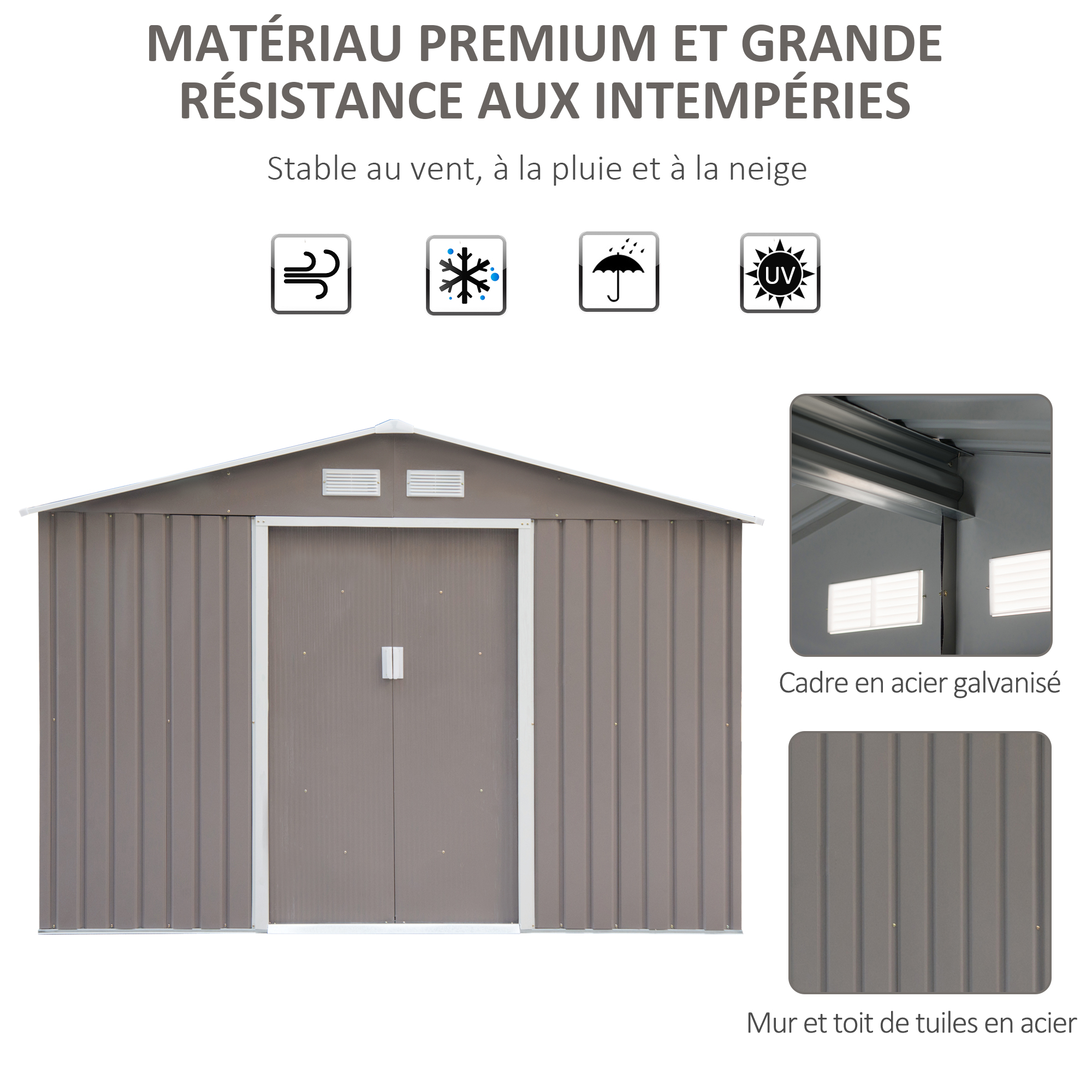 - Panneaux en tôle d'acier, châssis et fondation en tôle d'acier galvanisé robuste : usage pérenne