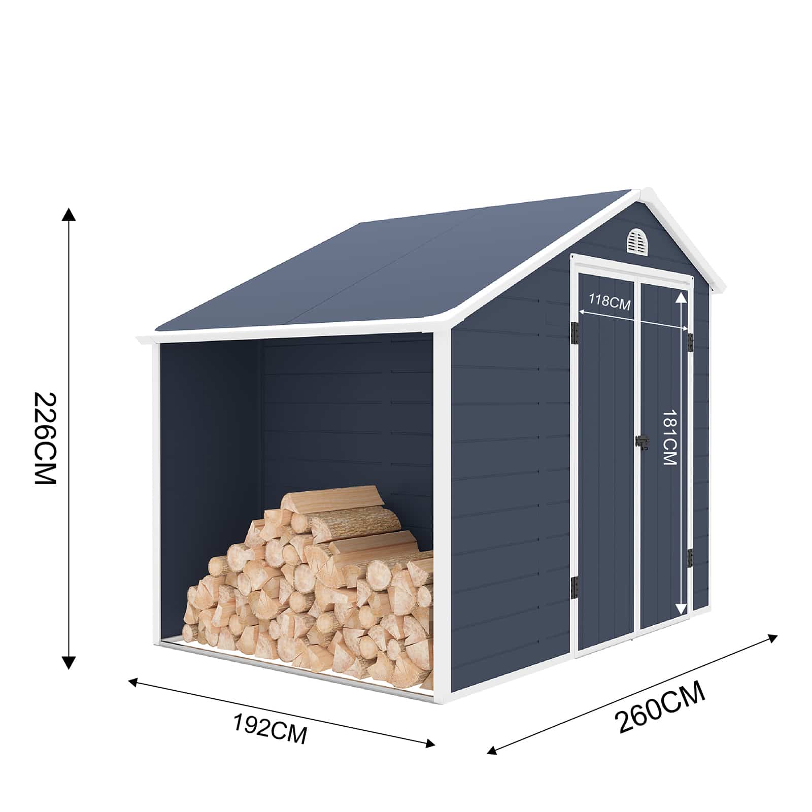 Abri en résine avec range bûches extérieur adapté au jardin ou à la terrasse. Le modèle Sylvana a un design contemporain bicolore (blanc et gris anthracite) avec un toit à deux pans. Les abris extérieurs en résine 2x1 permettent de stocker correctement le bois pendant les mois d'hiver. Ils gardent les bûches au sec grâce à leur toit et vous permettent de ranger vos outils ou vos outils de jardin en évitant tout vol éventuel ou toute détérioration due à la pluie, au vent ou à l'humidité. De plus, sa double porte battante vous permettra d'ajouter une serrure (non comprise). Votre tondeuse à gazon ou vos accessoires de piscine seront bien rangés et à l'abri de tout regard indiscret. Sa fenêtre latérale apportera la lumière intérieure et ses grilles d'aération permettront une bonne ventilation, augmentant ses possibilités en tant que petit atelier. Les panneaux de l'abri ont une protection UV résistante au passage du temps et ses renforts métalliques donneront à la structure une plus grande stabilité. L'épaisseur des panneaux est de 12 mm et ils sont préassemblés pour faciliter le montage. Caractéristiques : - Surface totale : 5 m². - Dimensions extérieures : 260x192x226 cm. - Dimensions intérieures : 246x180 cm. - Matériau : Polypropylène. - Épaisseur : 12 mm. - Cadre et structure : acier galvanisé. - Type d'Union : Vis et rondelles. - Porte : 118x181 cm. - Type de porte : Double porte battante. - Toit : Deux pans. - Plancher : Non. Barres de soutien dans la partie du range bûches pour éviter que le bois soit en contact direct avec le sol. - Fenêtre : Oui, 1 côté. - Grilles d'aération : 2. - Couleur : gris anthracite, blanc. - Poids : 91 kg. - Espace recommandé : 270x202x236 cm. - Nettoyage à l'eau et au savon. - Garantie du fabricant, Gardiun. *Bois non compris