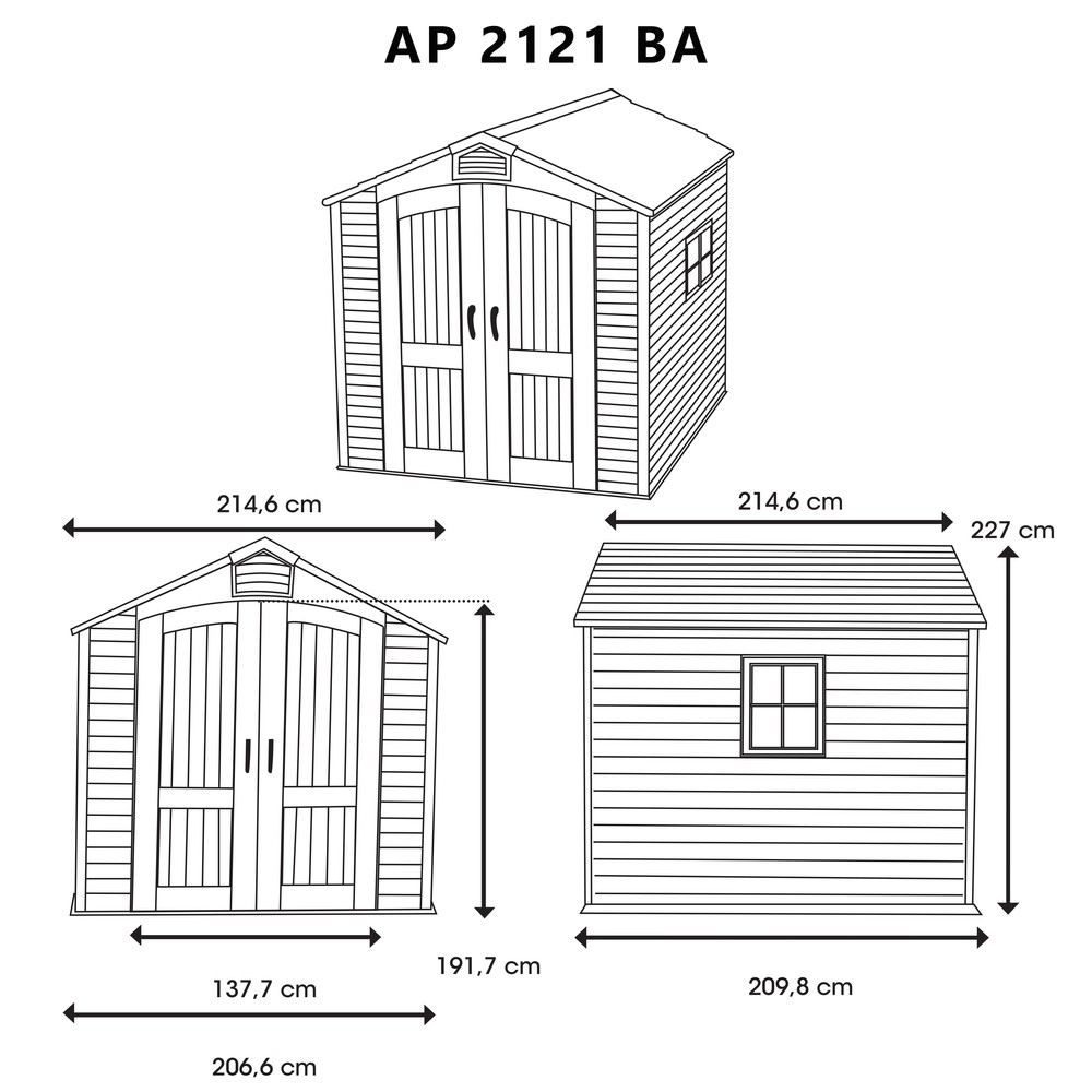 | Libellé | Abri de jardin résine PEHD imitation bardage grand volume avec plancher et toit 2 pentes / 4,57 m2 |