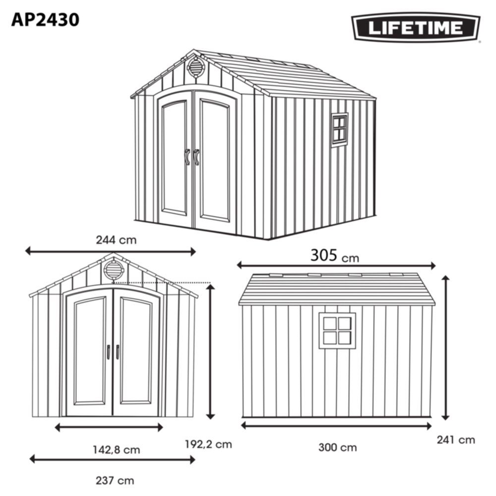 | Libellé | Abri de jardin résine PEHD imitation bois grand volume avec plancher et toit 2 pentes / 7,44 m2 |