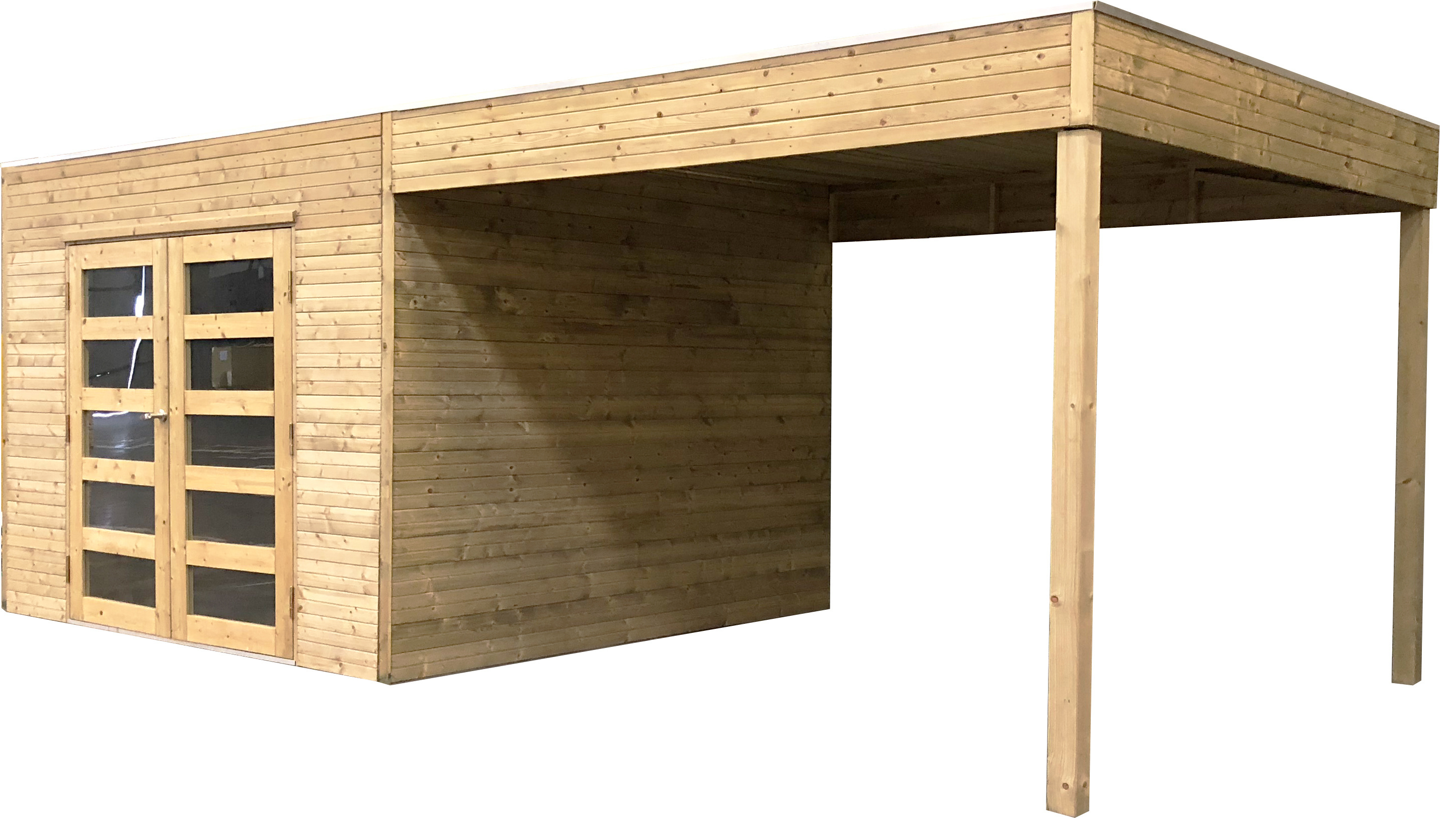 Abri de jardin en panneaux de 19 mm , les dimensions au sol : 298 + 287 X 198 cm soit une surface utile de 5,37 m² et une surface hors tout de 11,65 m² . Double porte battante avec une serrure à clés , grilles de ventilation , planchettes de toiture de 16 mm avec membrane EPDM , rail en aluminium de 2 cm pour un accès facile . Auvent lattéral : 198x 287 cm