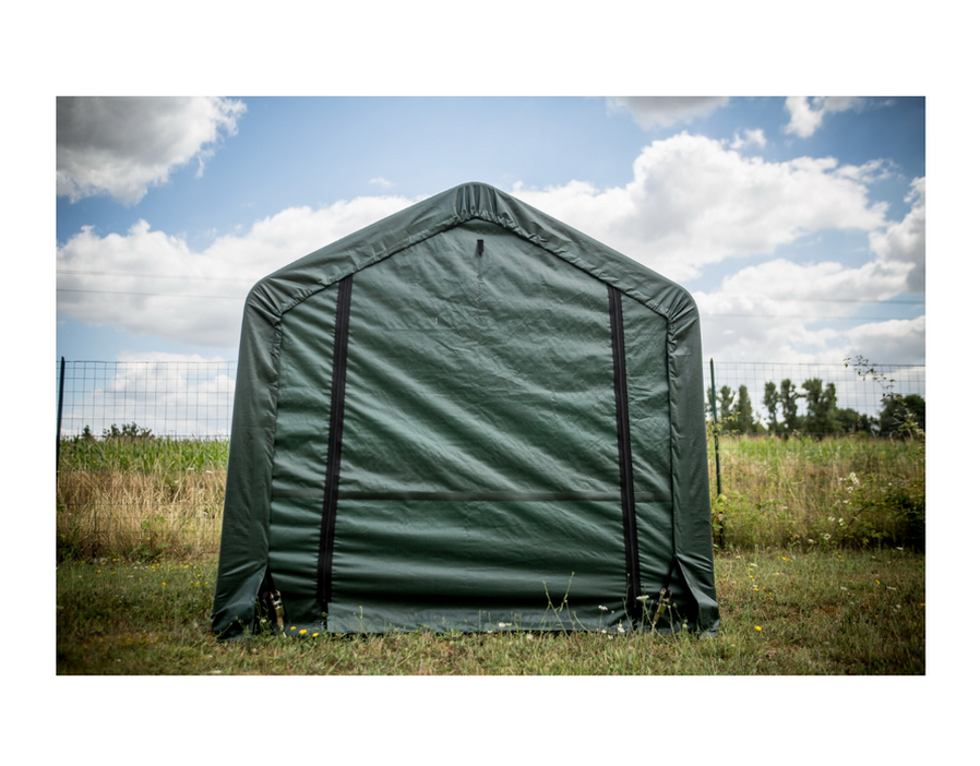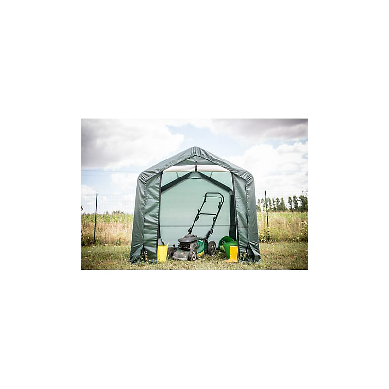 at1818 - abri en toile renforcée 3,35 m2 toit 2 pentes - L'abri en toile renforcée Habritas AT 1818 offre un grand volume de stockage de 6,10 m3 et un été mis au point pour ranger et protéger: - outils de jardin: tondeuse, outils emmanchés ... - vélo, scooter, moto. - sacs de charbon de bois, de pellets, bois de chauffage. Simple et rapide à installer, à déplacer et à démonter le cas échéant, cet abri temporaire ou permanent, selon votre choix, propose de nombreuses solutions de rangement économique. Pratique par sa simplicité d'utilisation, il innove par son design. Mis au point à partir des technologies issues du monde agricole, l'abri est une véritable barrière contre les intempéries grâce aux matériaux de haute qualité. Son coloris vert foncé extérieur est idéal pour se fondre dans votre jardin, son intérieur blanc est parfait pour refléter la lumière du jour et offrir une plus grande clarté interne. Idéal par sa fonctionnalité, l'abri en toile renforcée ne nécessite pas de connaissances particulières en construction. Avec sa toile renforcée par 3 canapés en polyéthylène offrant une résistance de 195 gr / m2 et sa structure acier de 34 mm, vous disposez d'un abri d'une très grande robustesse, capable de rivaliser avec les abris en métal. La porte d'une largeur de 1,30 m pour 1,38 m de haut offre une grande ouverture permettant un accès facile pour les objets encombrants. L'abri en toile renforcée a été mis au point pour vous garantir une protection optimale de votre matériel, par la robustesse de sa toile et sa structure, associé à son ancrage au sol garantissant un maintien de celui-ci face aux intempéries. Un abri ultra résistant par sa haute qualité! Sa structure tubulaire a été conçue dans un acier de haute qualité d'une épaisseur de 0,7 mm pour un diamètre de 3,4 cm. Pour renforcer sa résistance aux intempéries, à prévoir ambiant, les tubes ont été recouverts d'une peinture de haute protection garantissant la longévité de celle-ci. La toile en polyéthylène de 195 gr / m2 bénéficie d'un traitement anti-UV pour résister aux rayons du soleil et de la lune. Ingénieux et Simple à mettre en place! Sa structure tubulaire dispose d'un système de montage par clips, permettant un montage rapide et précis réalisable par une ou deux personnes. L'ingénieux système de serrage par des sangles à cliquets permet de guider la tension de la toile à tout moment, pour éviter toute création de poches d'eau ou de neige. Soucieux doit un produit garantissant une sécurité maximale, l'abri en toile renforcée est équipé d'un kit d'ancrage. Disposé aux extrémités de l'abri, il permet de s'assurer de la bonne assise rectangulaire de la structure et de son ancrage au sol. Ainsi, vous êtes assuré de sa résistance aux rafales de vents, aux fortes pluies et aux chutes de neige.