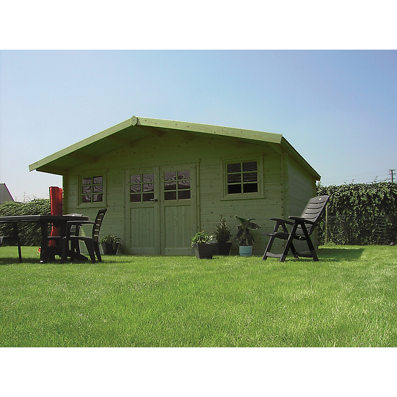 Abri jardin bois Zürich - 19.71 m² - 508 x 388 x 253 cm .Structure:Bois traité autoclave.Surface intérieure (m²):17.65 m².Surface extérieure (m²):19.71 m².Intérieures:484 x 364 x 191 cm.Extérieures:508 x 388 x 253 cm.Hors tout:529 x 455 x 253 cm - 24.80 m².Hauteur des murs:191 cm Epaisseur des madriers (côté) : 28 mm.Hauteur faîtage:253 cm.Dimensions:159 x 174 cm.Type:Porte double.Fenêtre:2 fenêtres S'ouvrent en oscillo-battant.Épaisseur:28 mm.Origine:Belgique.Type de toiture:Feutre bitumé Epaisseur du toit : 16 mm Résiste aux intempéries (75 kg/m²) Résiste au vent (30 kg/m²).Surface de la toiture:23.74 m².Pourcentage de la pente:14 °.Système d'aération Surface à peindre : 44.20 m² Rebord d'entrée Verres de sécurité Poignée de sécurité pour enfants.Dimensions de la dalle béton:568 x 388 cm.Colisage:1 colis : - 5,43 x 1,1 x 0,52 m, 980 kg.Dimensions:18 - 20 m².