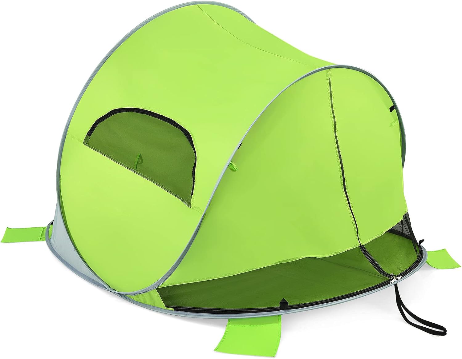 - Construction plus durable : La tente est construite à partir de tige en fibre solide durable, moins sujet à la distorsion. La base de la tente est équipée de quatre sacs de sable, quatre cordes à vent et huit clous au sol pour la maintenir en place en cas de climat venteux.