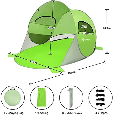 - Design rétractable et espace large: Cette tente de plage rétractable se monte en une seconde sans aucun effort d’assemblage. Sa taille dépliée est de 220x159x118cm, avec une porte frontale de 95,5cm qui peut convenir parfaitement à 3-4 personnes. Elle vient avec un sac de transport qui peut se ranger facilement dans une voiture.