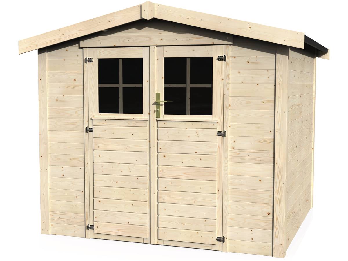 Abri jardin bois Mareuil - 4.99 m² - 2.30 x 2.17 x 2.12 m - 28 mm Constitué de madriers rainure et languette 28mm, 2 coupes droites, à visser sur poteaux d'angle.Structure:Sapin Blanc du Nord naturel - à traiter par le client avant montage .Surface intérieure (m²):4.62 m².Surface extérieure (m²):4.99 m².Intérieures:2.21 x 2.09 x 1.83 m.Extérieures:2.30 x 2.17 x 2.12 m.Hors tout:2.57 x 2.39 x 2.12 m.Hauteur des murs:1.83 m.Hauteur faîtage:2.12 m.Dimensions:Largeur 1.25 m x Hauteur 1.73 m.Type:Porte double , sur barres apparentes , à vitrerVitrage : synthétique 1.5 mm - Croisillons : lattes inclusesFermeture : verrouFixation : gonds réglables.Fenêtre:Pas de fenêtre.Type de toiture:OSB - Toile bitumé noire 1.5 mm en rouleau.Pourcentage de la pente:12.9° = 23%.Conseils pratiques:Livraison en kit, à monter soi même. Toutes fournitures de montage comprises.Colisage:1 colis : - 2,35 x 1,05 x 0,51 m, 337 kg.