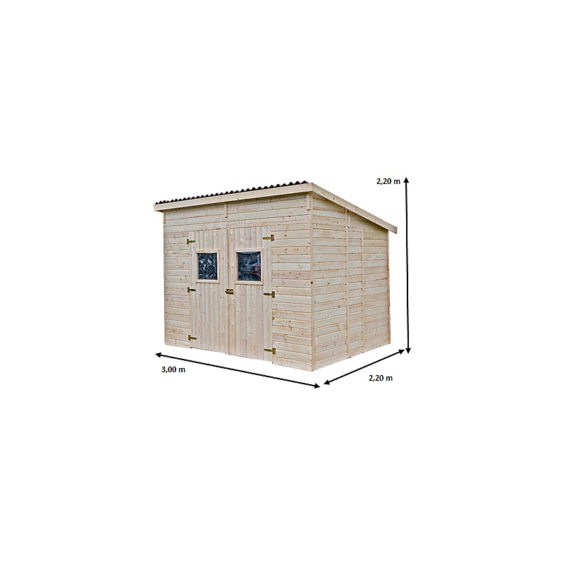 | Libellé | Abri panneaux bois massif 16 mm toit mono pente sans plancher 6,60 m2 |