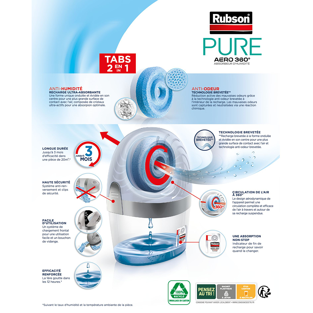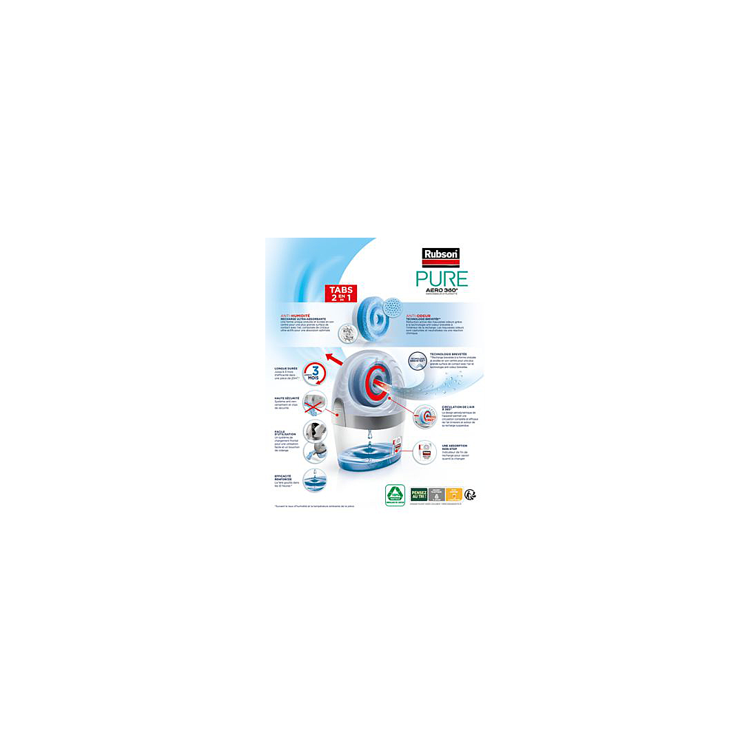 L’absorbeur d’humidité AERO 360° permet de réguler le taux d’humidité de votre intérieur. Avec ses recharges ultra absorbantes, AERO 360° a des effets bénéfiques sur : - votre santé : AERO 360° prévient des allergies (développement des acariens), des rhumatismes et des problèmes articulaires, de la sensation de froid et d’air trop humide - votre patrimoine : AERO 360° lutte contre le développement des traces d’humidité, le papier peint décollé, la peinture cloquée,… - votre confort : AERO 360° évite la condensation et les mauvaises odeurs dans votre intérieur (linge,…) - Longue durée : 2 à 3 mois (selon le taux d’humidité de votre intérieur) - Ne consomme aucune énergie