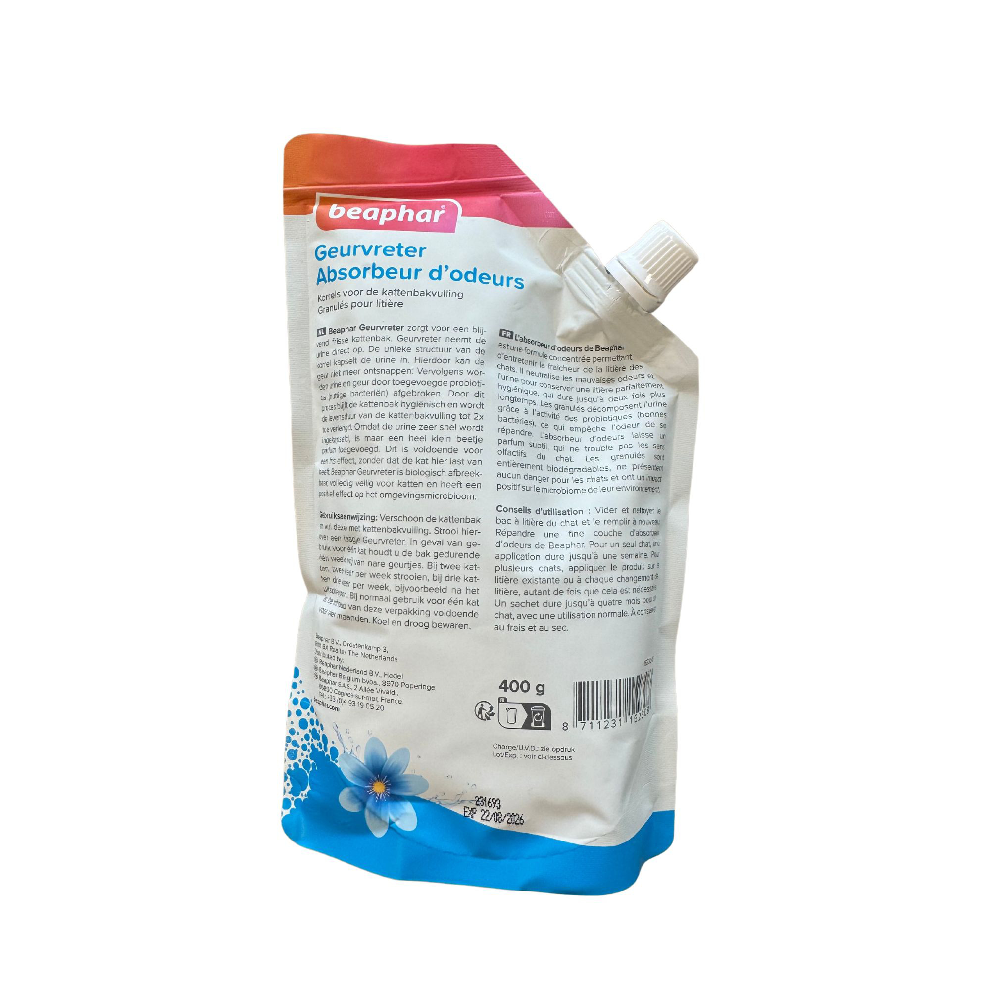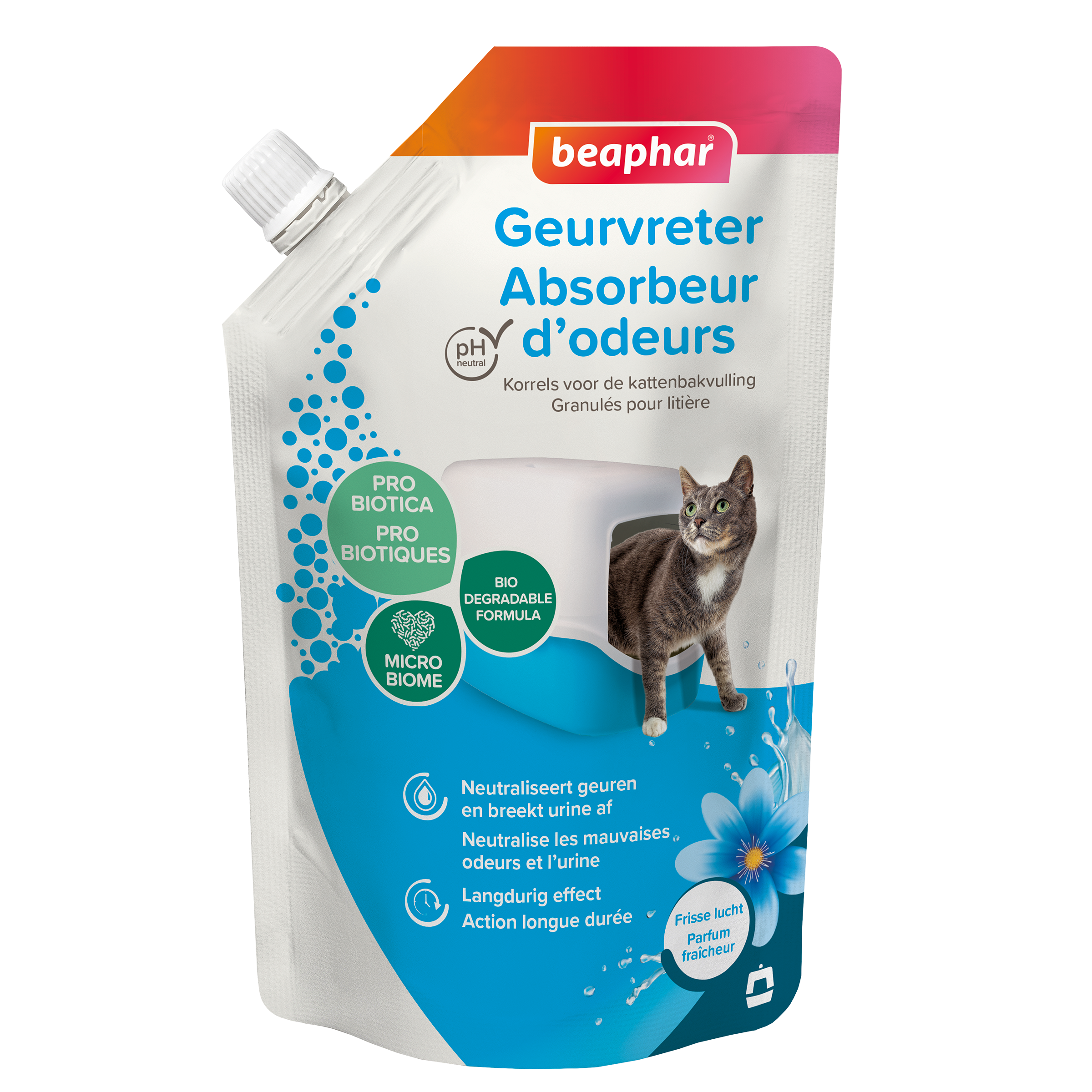L’absorbeur d’odeurs de Beaphar est une formule concentrée permettant d’entretenir la fraîcheur de la litière des chats. Il neutralise les mauvaises odeurs et l’urine pour conserver une litière parfaitement hygiénique, qui dure jusqu’à deux fois plus longtemps. Les granulés décomposent l’urine grâce à l’activité des probiotiques, ce qui empêche l’odeur de se répandre. L’absorbeur d’odeurs laisse un parfum subtil, qui ne trouble pas les sens olfactifs du chat. Les granulés sont entièrement biodégradables, ne présentent aucun danger pour les chats.