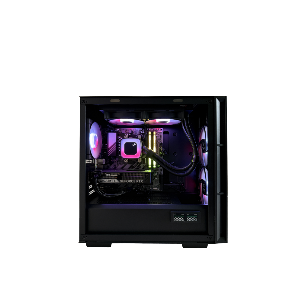 | Plus produit | Boîtier mid-tower avec panneau latéral en verre trempé, refroidissement AIO 240 mm, ventilateurs RGB, carte GeForce RTX (marquage GIGABYTE visible), câblage gainé et affichage 7 segments sur le shroud PSU. |