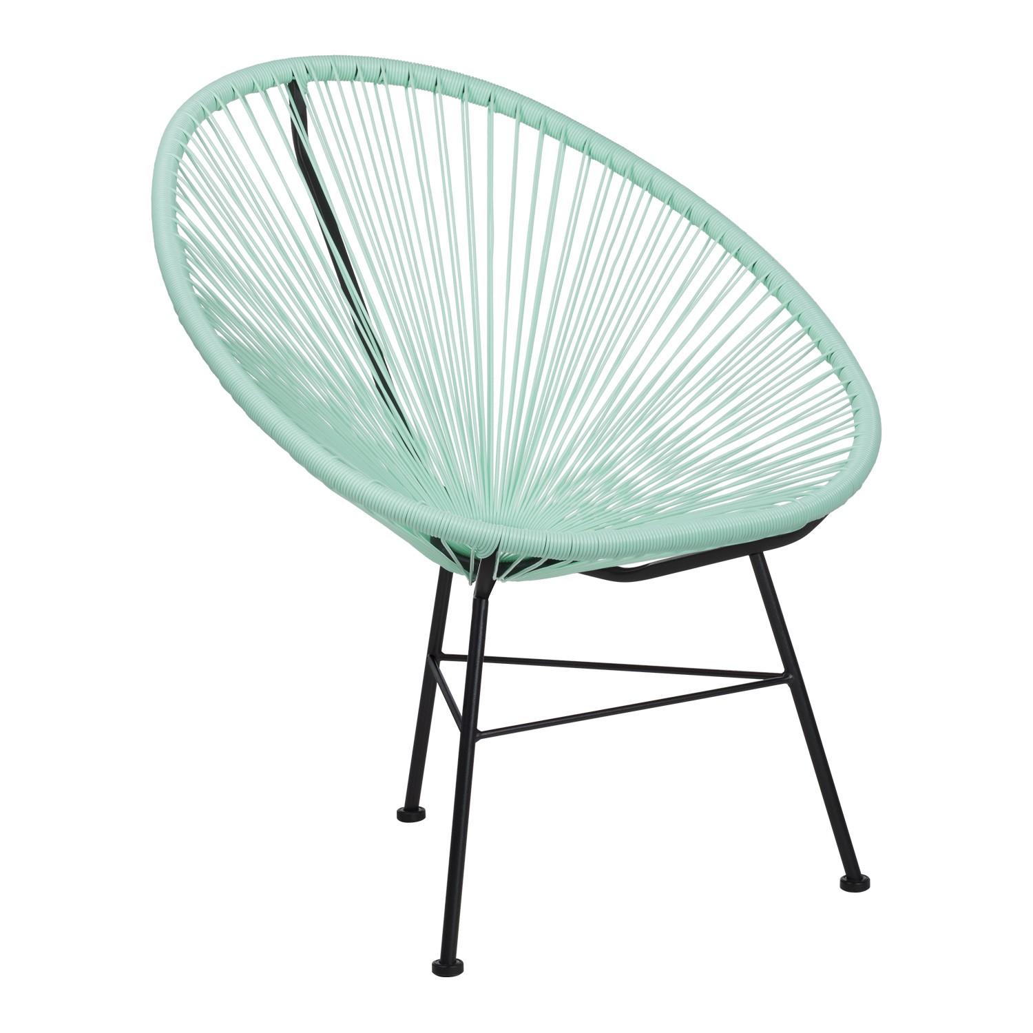 Très belle chaise Acapulco vert. C'est une pièce originale, confortable et élégante. Elle peut aussi bien être utilisée en intérieur comme en extérieur. Sa structure est en acier et le siège en polyéthylène. Hauteur: ~83,5 cm Largeur: 72 cm Profondeur: 83 cm Hauteur du siège: ~46 cm Poids: 4,55 Kg Largeur des Pieds: 46 cm Largeur de Soutien: 72 cm