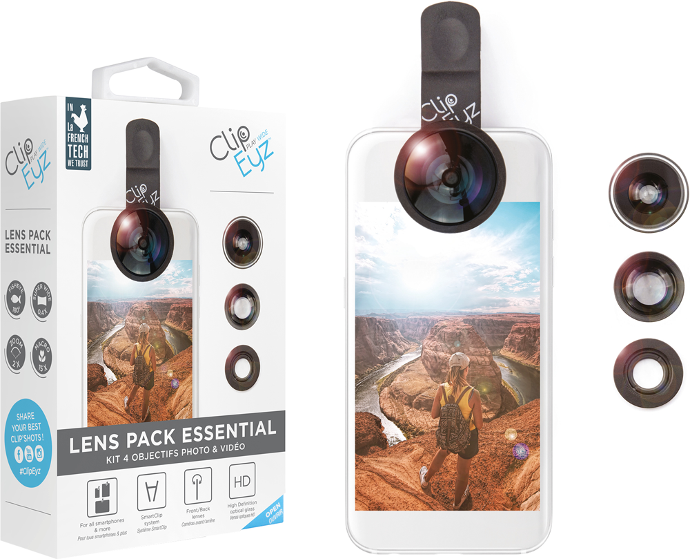 Matière : Plastique Dimensions : Universel Couleur : Noir Contenu du pack : 1 objectif FishEye + 1 objectif super large + 1 objectif Zoom + 1 objectif Macro + 1 smartclip Universel + 3 caches-objectifs + 1 pochette en microfibre + 1 sticker officiel Le Lens Pack Essential est le kit essentiel pour les passionnés de photo/vidéo. Avec notre système SmartClip, les objectifs en verre optique haute définition se fixent sur tous les smartphones, à l'avant comme à l'arrière. Paysages, nature, sports d'action, selfies... capturez et partagez d'incroyables images!