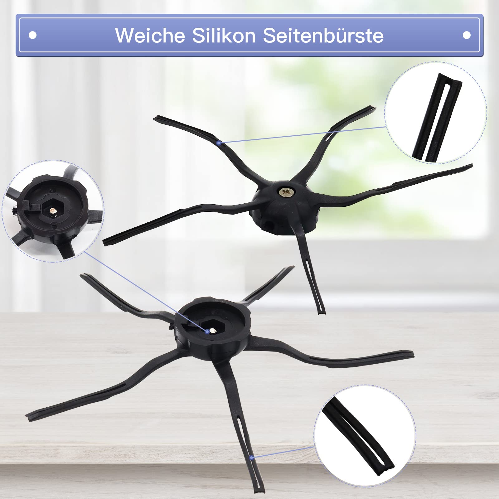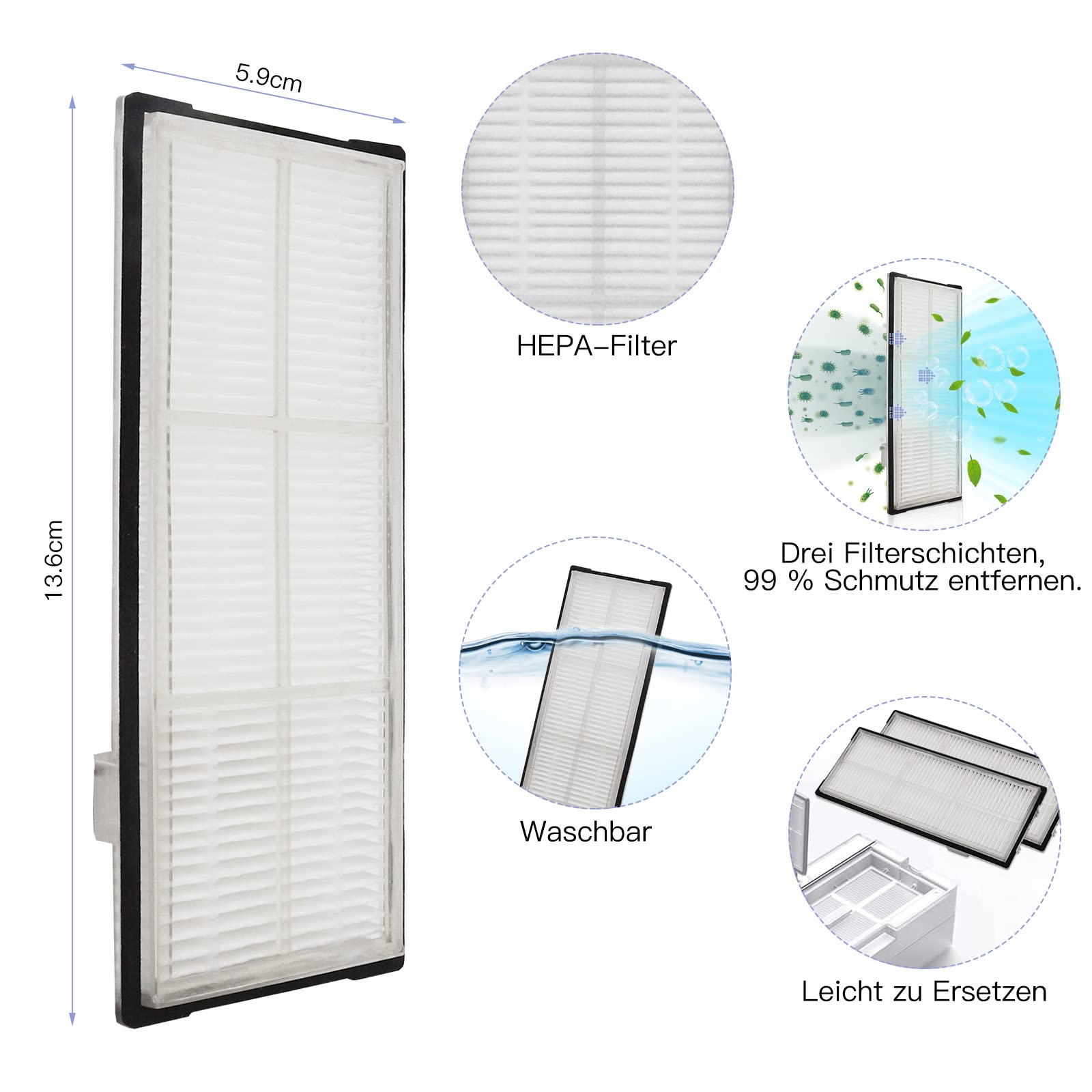 Taille : Filtre : 135 x 57 mm, serpillère : 29,5 x 11 cm, brosse latérale : 8,5 x 1 cm, brosse principale : 25 x 6 x 3 cm.
