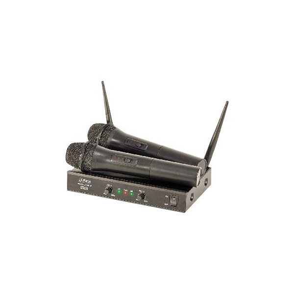 Système sans-fil UHF à 2 canaux composé de 2 émetteurs microphone main et d'un récepteur. La technologie UHF augmente la portée et la stabilité du signal. Idéal pour chanteurs, présentateurs, etc.