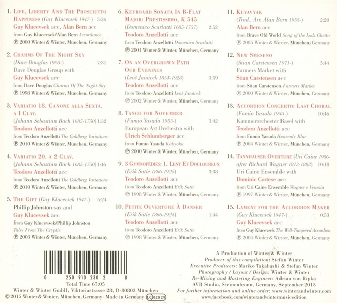 Le voyage de l'accordéon commence ici et maintenant et devient un voyage musical fascinant qui traverse les siècles. Il semble paradoxal que l'accordéon - qui vient d'être inventé en 1848, la grande année de la révolution - soit capable de révéler de nouveaux secrets de notre époque, jusqu'au début du baroque, sans ressentir les sauts dans le temps. L'oeuvre de Johann Sebastian Bach semble aussi vivante et fraîche que celle de son contemporain Fumio Yasuda. Les accordéonistes Teodoro Anzellotti, Alan Bern, Stian Carstensen, Dominic Cortese, Guy Klucevsek et Ulrich Schlumberger sont les meilleurs dans leur domaine, ils prennent l'auditeur par la main et le guident sans crainte à travers les temps modernes.