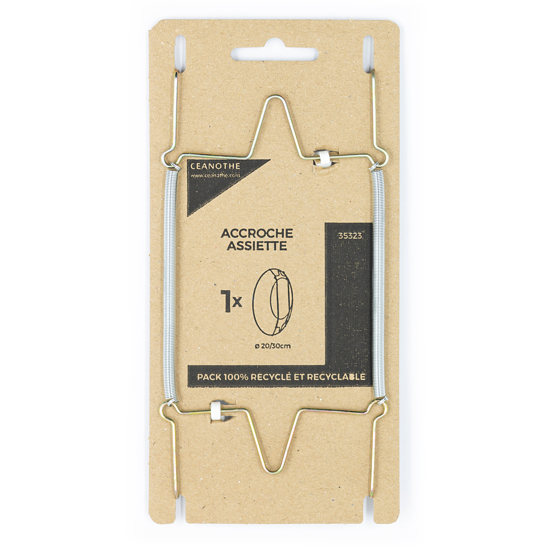 Kit accroche pour assiette de la marque Ceanothe. Il permet d'accrocher une assiette dont le diamètre doit être compris entre 20 et 30 cm. Cet accessoire fabriqué en France dispose d'un emballage recyclé et recyclable.