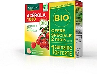 L’Acérola est une petite baie des Caraïbes et d’Amazonie, connue pour sa forte teneur en vitamine C. La vitamine C aide à réduire la fatigue et contribue également au bon fonctionnement du système immunitaire. ACEROLA BIO 1000 NATURLAND apporte 173 mg de vitamine C 100 % naturelle par comprimé qui vous aide à maintenir tonus et vitalité.