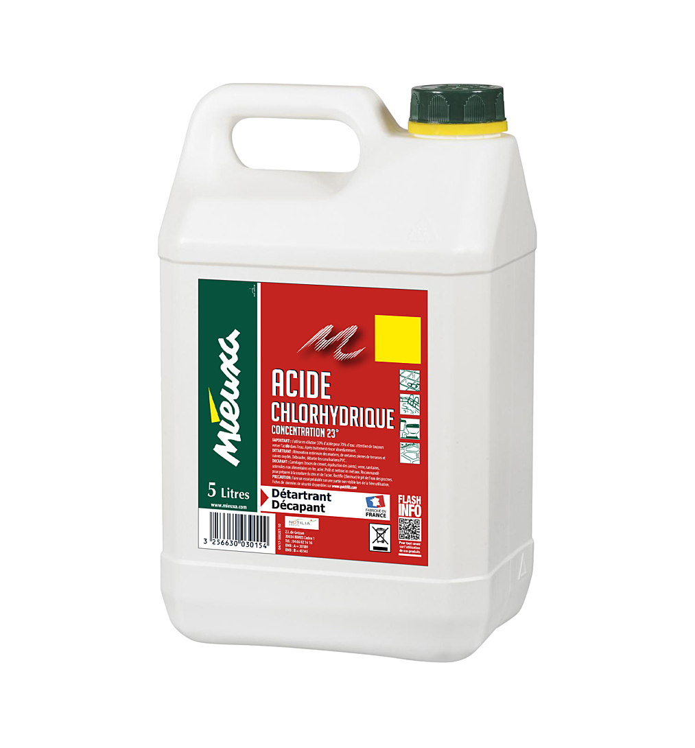 Acide chlorhydrique 23% Détartrant, décapant. Attention: Maintenir et transporter verticalement S'utilise en dilution 30% d'acide pour 70% d'eau: attention de toujours verser l'acide dans l'eau. Après traitement rincer abondamment. Détartrant: Rénovation extérieure des marbres, de certaines pierres de terrasses et cuivres oxydés. Débouche, détartre les canalisations PVC. Décapant: Carrelages (traces de ciment, égalisation des joints), verre, sanitaires, ustensiles non alimentaires en fer, acier. Polit et nettoie les métaux. Recommandé pour préparer à la soudure du zinc et de l'acier. Rectifie (diminue) le pH de l'eau des piscines.