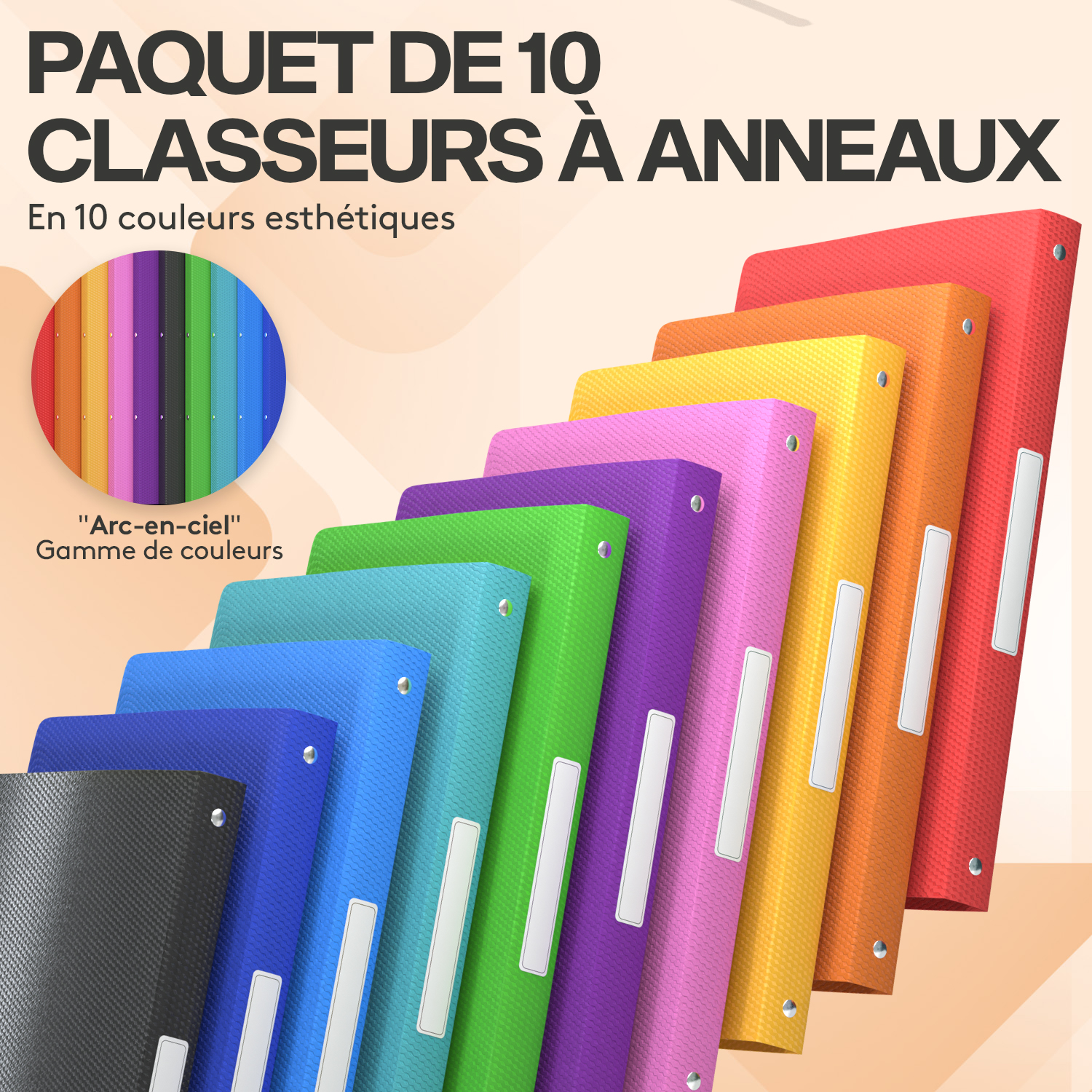 ACROPAQ 10x Classeur A4- 4 Anneaux- Dos 2,5 cm- Étiquettes de Dos- Jusqu'à 100 feuilles A4- PP- Souple Durable- Résisitants à l'eau La collection de classeurs à anneaux "Nature" d'ACROPAQ offre une organisation sans effort avec une esthétique élégante inspirée de la nature. Le dos fin de 2,5 cm maximise l'espace et peut contenir jusqu'à 100 feuilles A4 dans des chemises en polypropylène de 0,45 mm durables et résistantes à l'eau. Disponible en 10 couleurs vives pour une identification facile des documents. Mettez de l'ordre dans votre espace de travail et dites adieu au chaos !Informations sur le - Type d'anneau : Joint torique, 16 mm de diamètre- Largeur du dos : 25 mm, peut contenir jusqu'à 100 feuilles A4- Matériau : polypropylène lisse (PP), épaisseur de 0,5 mm : Polypropylène lisse (PP), épaisseur 0,5 mm- Finition : Motif mat sur le PP- Étiquette sur le dos : Oui. Gamme de couleurs : Assortiment arc-en-ciel de 10 couleurs- Couleurs incluses : Noir, bleu foncé, vert foncé, bleu clair, vert clair, orange, rose, violet, rouge, jaune (1 de chaque)