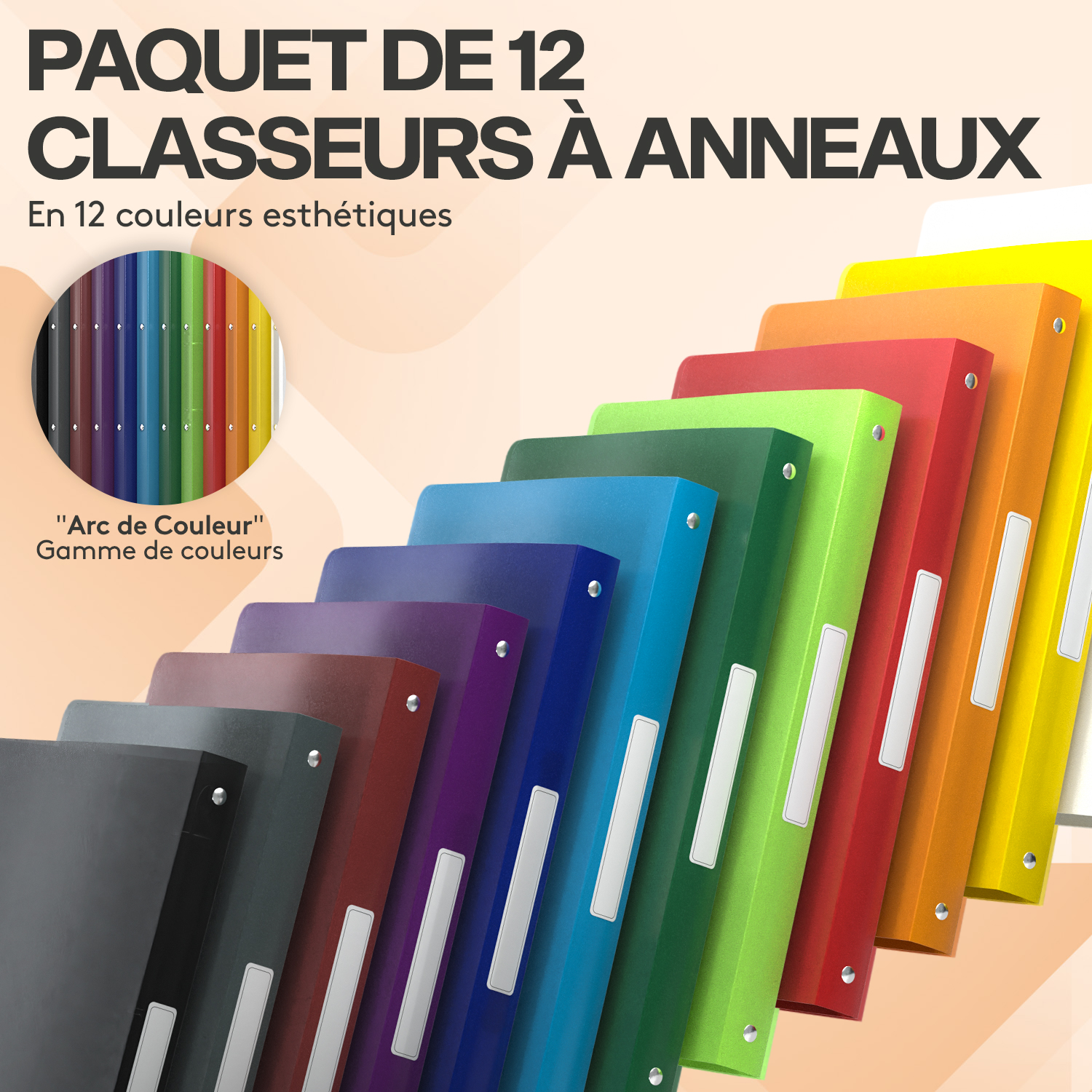 ACROPAQ 12x Classeur A4- 4 Anneaux- Dos 2,5 cm pour 100 feuilles- Étiquettes de Dos- PP- Souple- Résisitants à l'eau- Couleur Nature La collection de classeurs à anneaux "Nature" d'ACROPAQ offre une organisation sans effort avec une esthétique élégante inspirée de la nature. Le dos fin de 2,5 cm maximise l'espace et peut contenir jusqu'à 100 feuilles A4 dans des chemises en polypropylène de 0,45 mm durables et résistantes à l'eau. Disponible en 12 couleurs vives pour une identification facile des documents. Mettez de l'ordre dans votre espace de travail et dites adieu au chaos!Informations sur le produit : - Type : Classeur à anneaux- Format : Pour documents A4- Nombre d'anneaux : 4- Type d'anneau : Joint torique, 16 mm de diamètre- Largeur du dos : 22 mm, peut contenir jusqu'à 100 feuilles A4- Matériau : polypropylène lisse (PP), épaisseur de 0,5 mm : Polypropylène lisse (PP), épaisseur 0,5 mm- Finition : Motif mat sur le PP- Étiquette sur le dos : Oui, dimensions 15 x 95 mm- Dimensions de la reliure individuelle : 240 x 315 x 22 mm (largeur du dos)- Quantité : Paquet de 12 classeurs à anneaux- Dimensions de l'emballage : 290 x 75 x 330 mm - Gamme de couleurs : Assortiment arc-en-ciel de 12 couleurs- Couleurs incluses : Blanc, violet, bleu foncé, noir, rouge foncé, jaune, vert clair, orange, bleu clair, vert foncé, gris, rouge (1 de chaque)