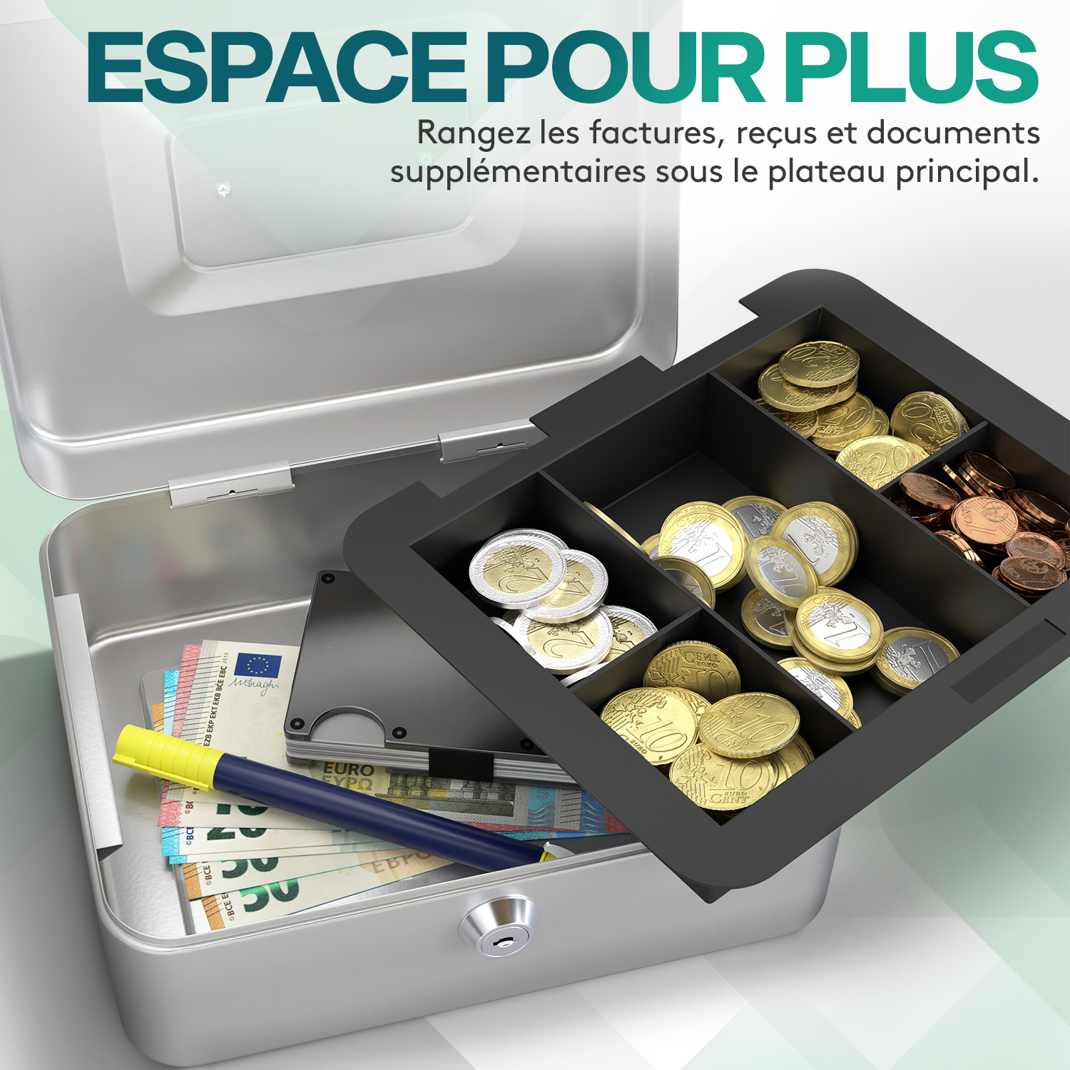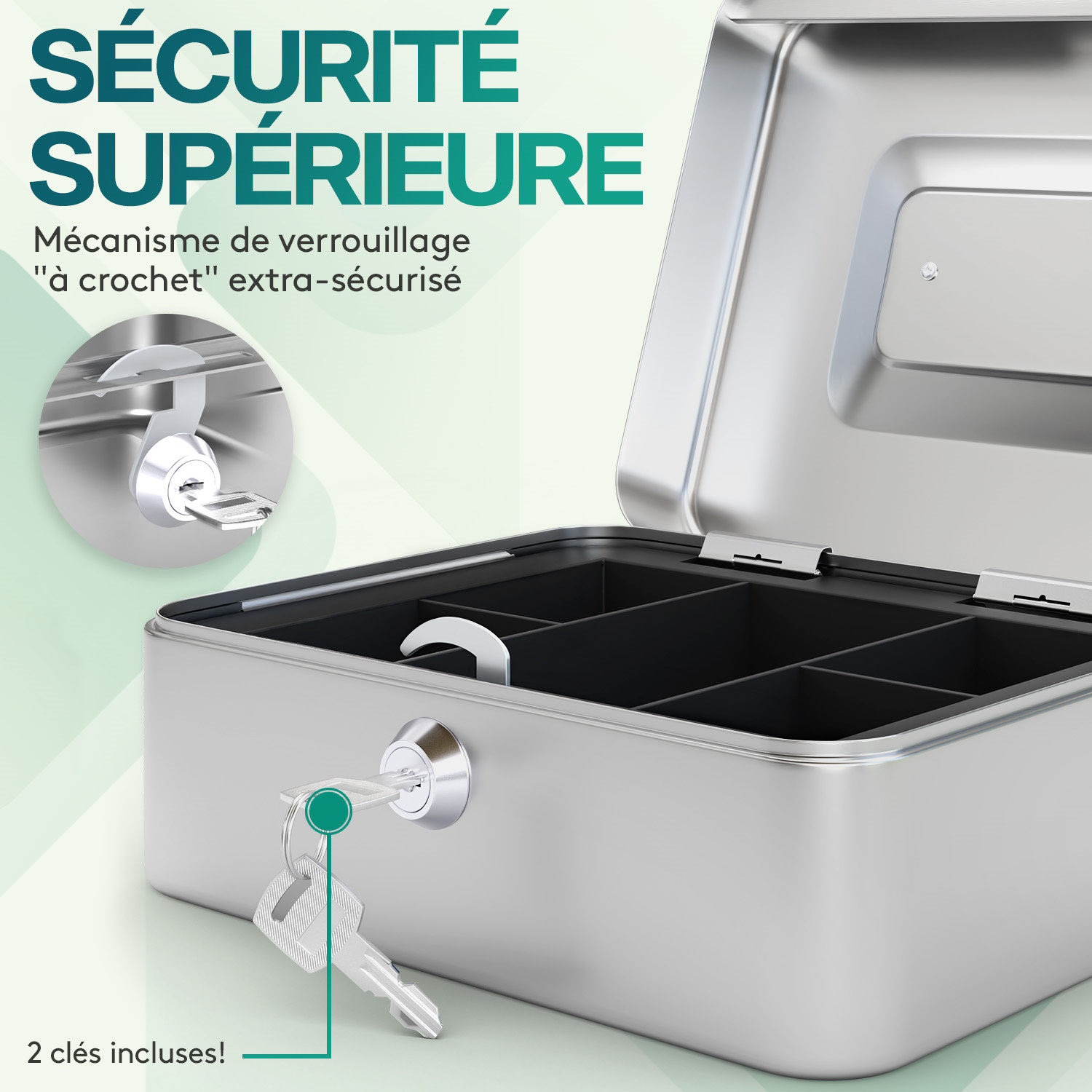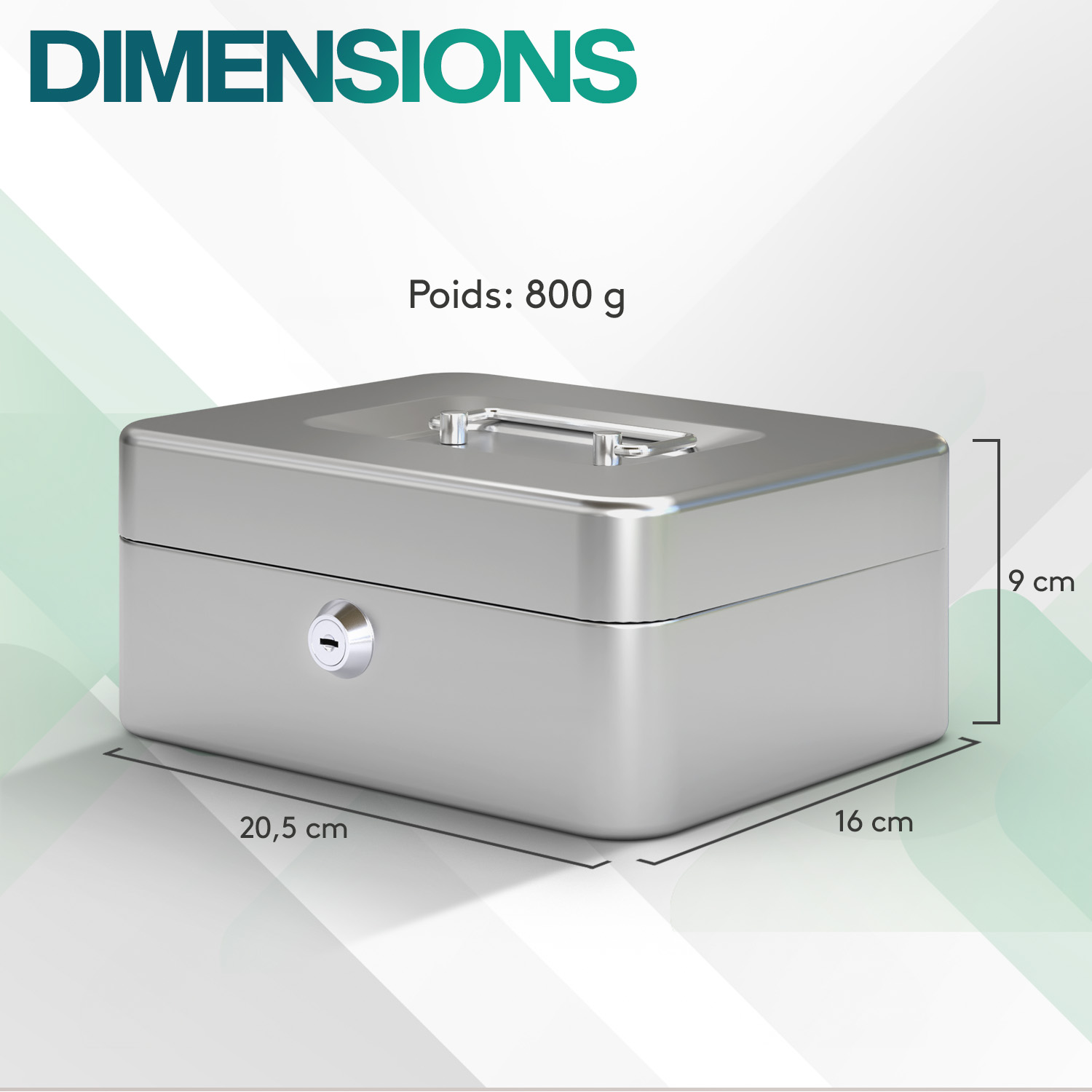 | Libellé | ACROPAQ Caisse à Monnaie - Petite caisse 20.5x16x9cm- 8 compartiments- 2 clés, Poignée de transport robuste- 100% sécurité - Argent |