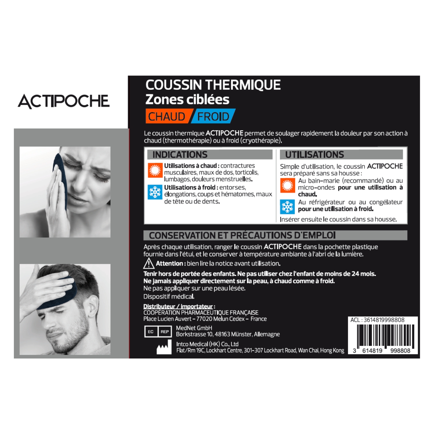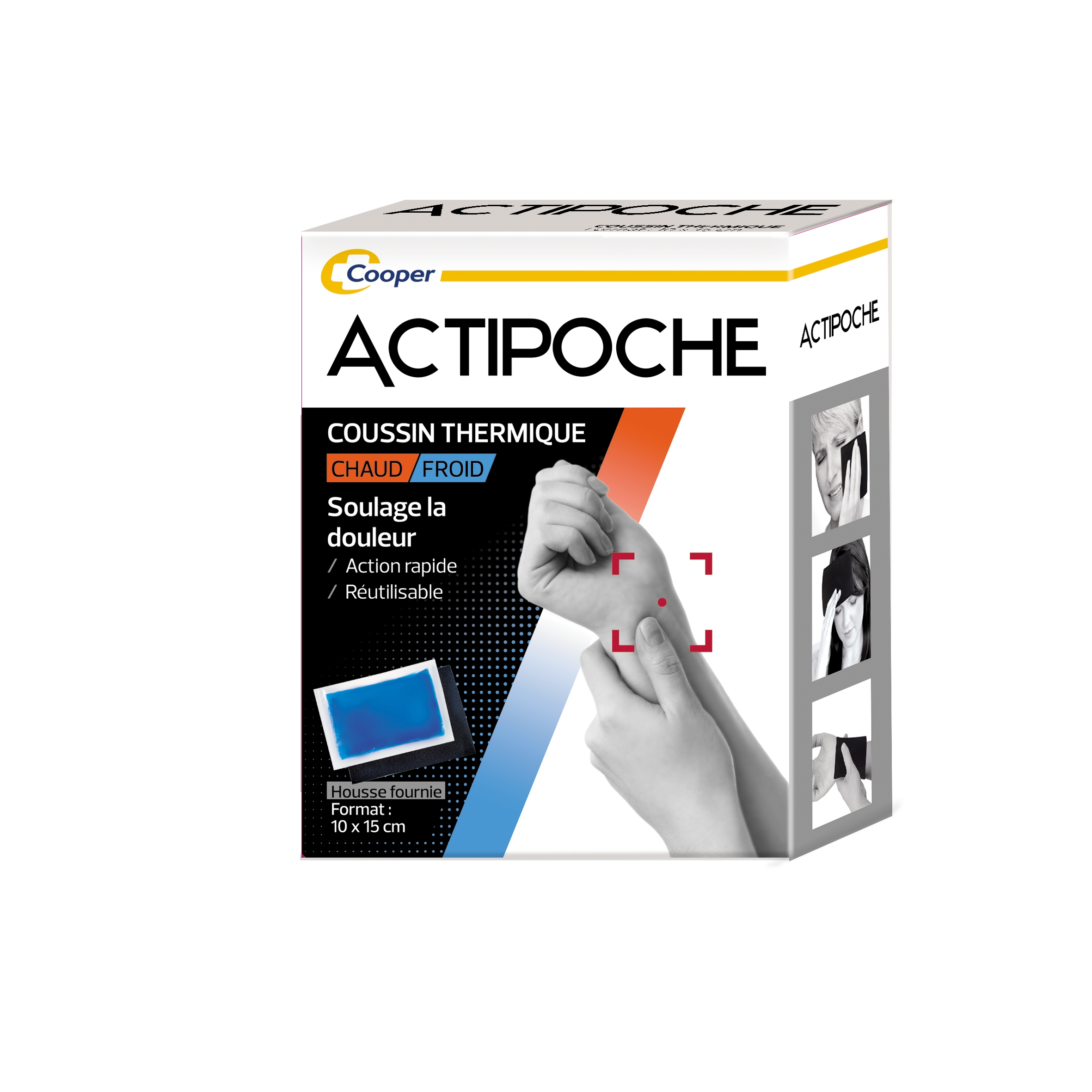 Selon l'usage souhaité, il suffit de les réchauffer (à l'eau chaude ou au micro-ondes) ou de les refroidir (au réfrigérateur ou au congélateur), de les insérer dans leur housse puis de les appliquer sur la zone douloureuse pendant environ 20 minutes.Le coussin thermique Actipoche de Bayer Petit modèle, de format 10 x 15 cm, est plus particulièrement adapté pour le traitement des bleus / bosses, les maux de tête ou de dents. Il est proposé avec une housse de protection.Coussin thermique pour application locale.Ce dispositif médical est un produit de santé réglementé qui porte, au titre de cette réglementation, le marquage CE. Veuillez lire attentivement les instructions figurant dans la notice. Consultez votre médecin ou votre pharmacien pour plus d’information.