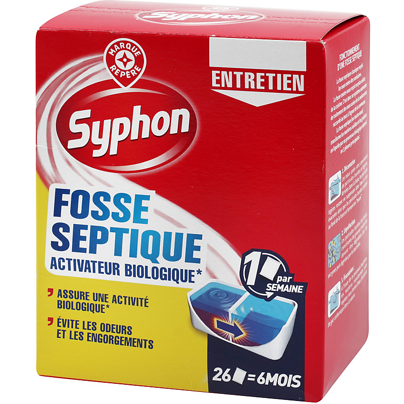ACTIVATEUR BIOLOGIQUE POUR FOSSE SEPTIQUE ET FOSSES TOUTES EAUX SYPHON CONTIENT ENTRE AUTRES INGRÉDIENTS : MOINS DE 5% : AGENTS DE SURFACES NON IONIQUES, PHOSPHATES. EGALEMENT : ENZYMES.