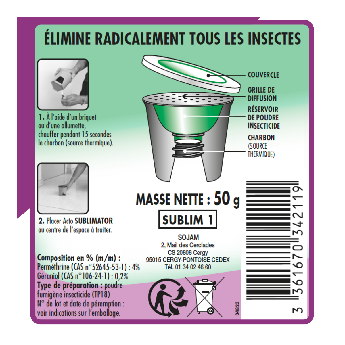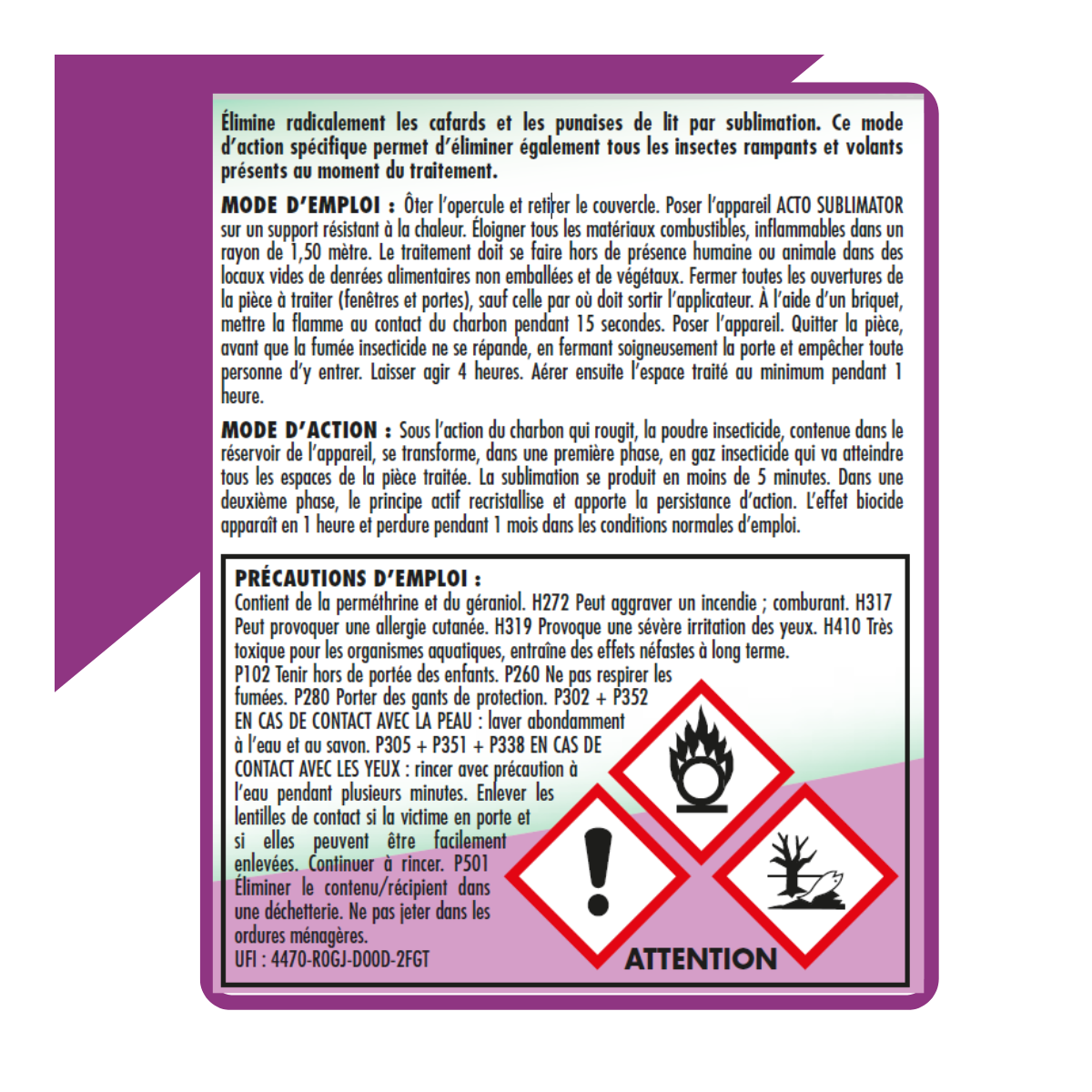 Acto SUBLIMATOR : la solution radicale contre les cafards et punaises de litL'Acto SUBLIMATOR est un produit d'exception conçu spécialement pour éliminer radicalement les cafards et les punaises de lit. Il est également efficace contre tous les insectes rampants et volants présents au moment du traitement.Méthode d'utilisationPour utiliser l'Acto SUBLIMATOR, il suffit d'ôter l'opercule et de retirer le couvercle. Prévoyez de poser le diffuseur sur un support résistant à la chaleur et éloignez tous les matériaux combustibles dans un rayon de 1,50 m. Allumez-le avec un briquet pendant 15 secondes puis laissez agir 4 heures avant d'aérer l'espace traité pendant au moins 1 heure.Mode d'actionGrâce à l'action du charbon qui rougit, la poudre insecticide contenue dans l'appareil se transforme en gaz insecticide. Elle atteint tous les espaces de la pièce traitée en moins de 5 minutes. Le principe actif recristallise pour une persistance d'action. L'effet biocide apparaît en 1 heure et perdure pendant 1 mois dans les conditions normales d'emploi.CompositionL'Acto SUBLIMATOR contient de la perméthrine et du géraniol. Ces substances, bien que très efficaces contre les insectes, peuvent aggraver un incendie, provoquer une allergie cutanée, une sévère irritation des yeux et sont toxiques pour les organismes aquatiques.Précautions d'emploiIl est impératif de suivre les consignes de sécurité lors de l'utilisation de l'Acto SUBLIMATOR. Tenez-le hors de portée des enfants, ne respirez pas les fumées, portez des gants de protection et en cas de contact avec la peau ou les yeux, lavez abondamment à l'eau et au savon. Éliminez le contenu/récipient dans une déchetterie.Made in FranceConçu et fabriqué en France, l'Acto SUBLIMATOR est idéal pour les grandes surfaces.Utilisez les biocides avec précaution. Avant toute utilisation, lisez l'étiquette et les informations concernant le produit..
